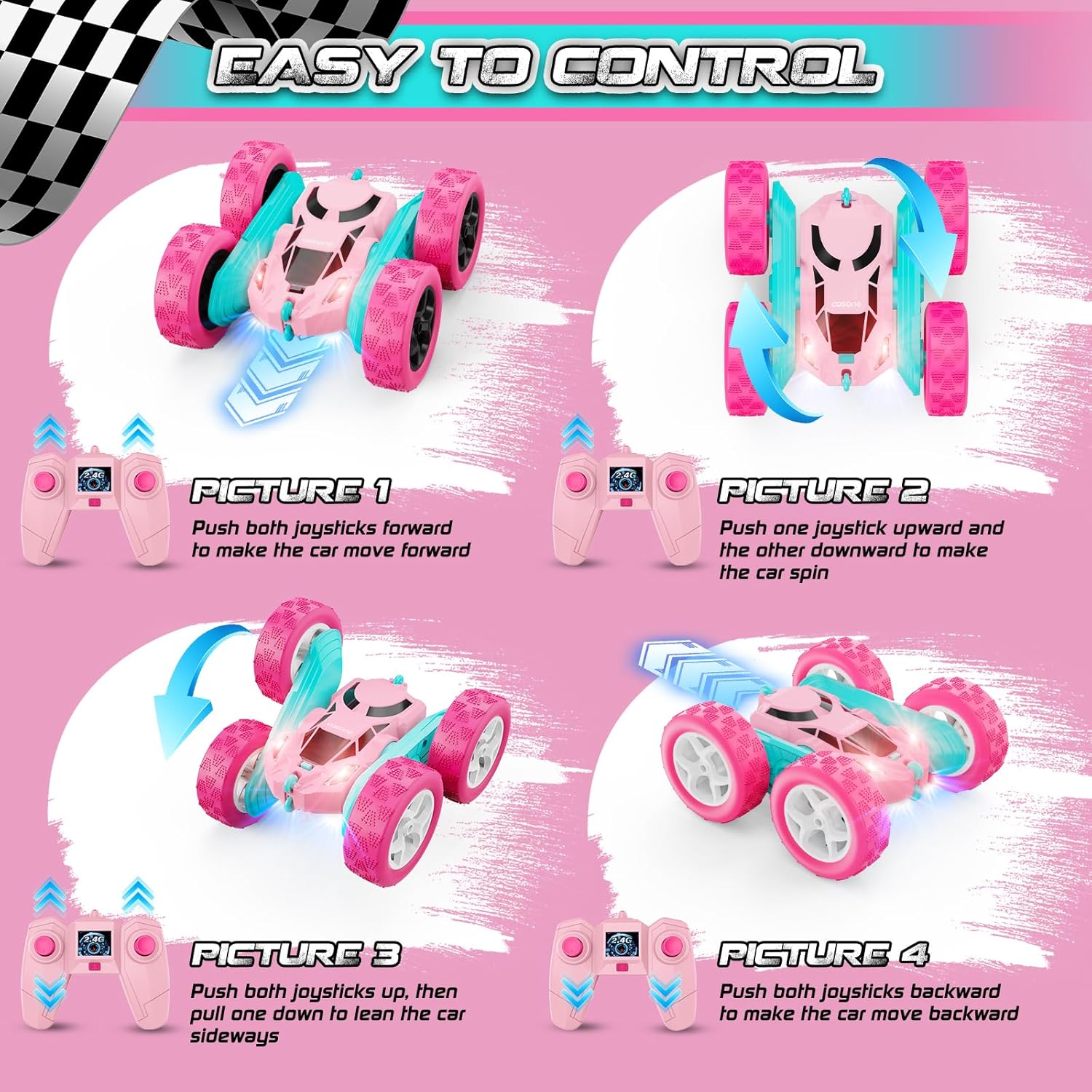 Pink Remote Control Car for Girls - RC Stunt Cars with 4WD Double-Sided Driving 360° Flips Rotating, Off Road Remote Car Outdoor Toys for Kids Age 6 7 8-12, Christmas Birthday Gifts