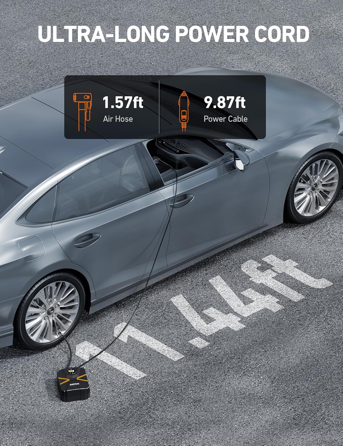- Ultra-Long Power Cord & Emergency LED Light: With a 1.57ft long air hose and a 9.87ft long power cord, the car tire inflator is easily connected to any tire. The integrated LED light is great for emergencies and working in dark environments. When the digital tire inflator is powered, the LED light will illuminate.