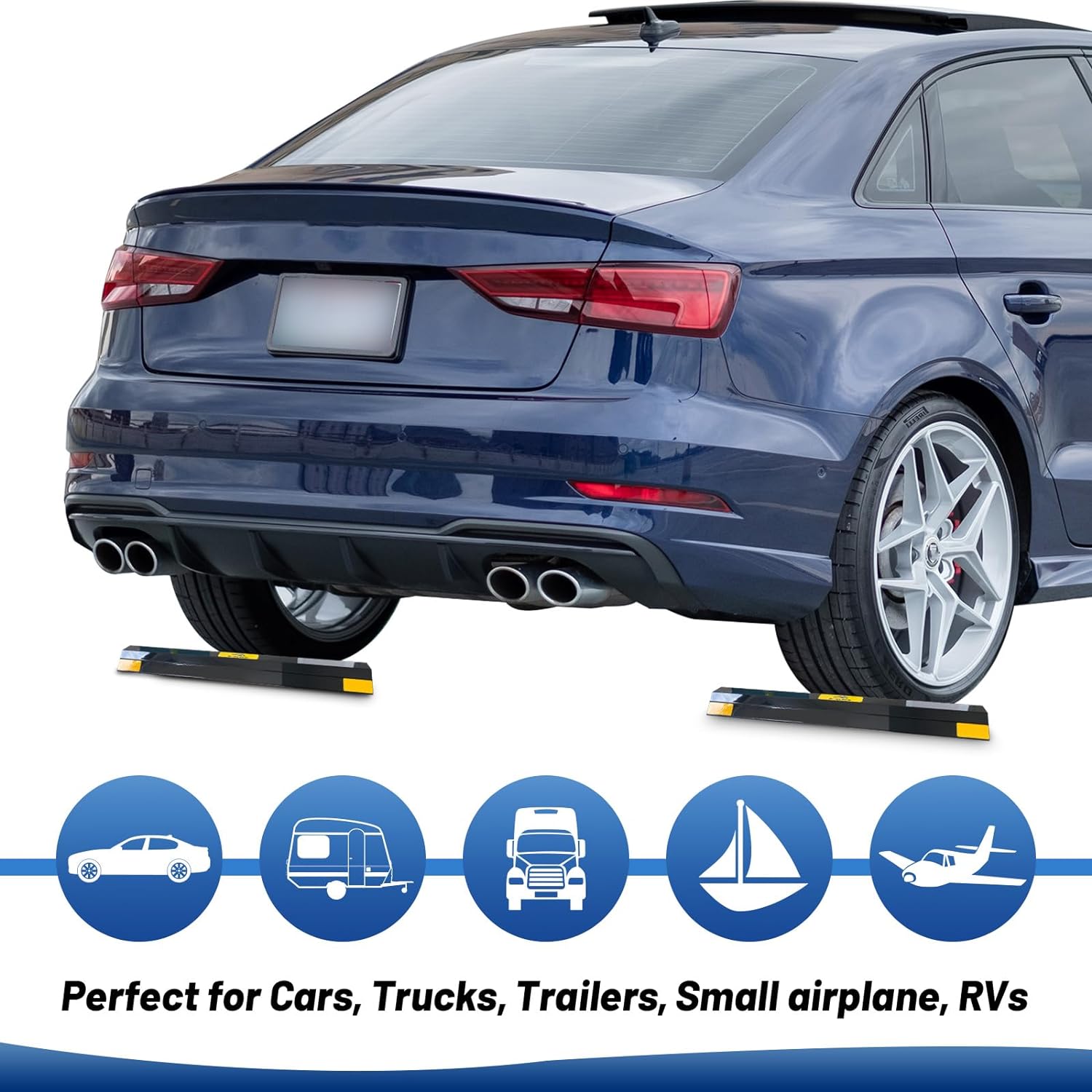 - [UPGRADED LENGTH & HEIGHT]: The upgraded parking aid design increases the length to 24 inches, height to 1.8 inches, can prevent tires from out-running the parking stopper more effectively, avoid hitting the walls or other parked cars. Securing your car to the ground better and making parking more safer every time.