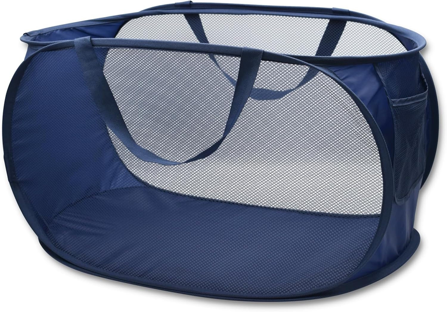 HONOMA Sturdy Mesh Laundry Hamper Basket Bag,Pop up Basket with Side Pocket for Laundry Room, Bathroom, Kids Room, College Dorm or Travel (Pop Horizontal, Navy Blue)