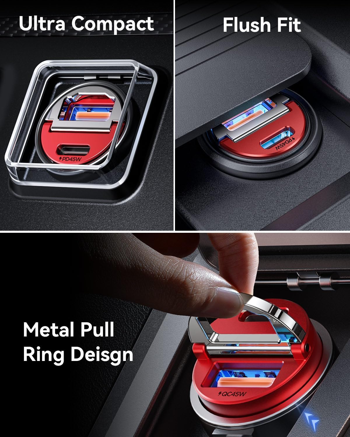 - THUMB-SIZED, PULL RING DESIGN: The smallest flawlessly cigarette lighter usb charger on the market until now. With a tiny-sized body, fits snug and flush into the lighter outlet does not protrude which perfectly hides in your cigarette lighter adapter. Never popup while driving and won't block the cover of the cigarette lighter. So we designed a pull-ring to help you unplug from the car cigarette lighter easier