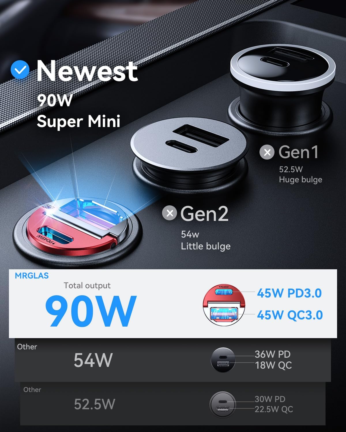 - OFFICIALLY APPROVED CHIP, AIM FOR FASTER & SAFER: MRGLAS fast car charger adapter Built-in PD45W&QC45W dual-core intelligent identification chip outputs 45W of fast charging current in each of its two cores, And the latest security control chip, which is a safe and high-speed Fast Car Charger without damaging the device