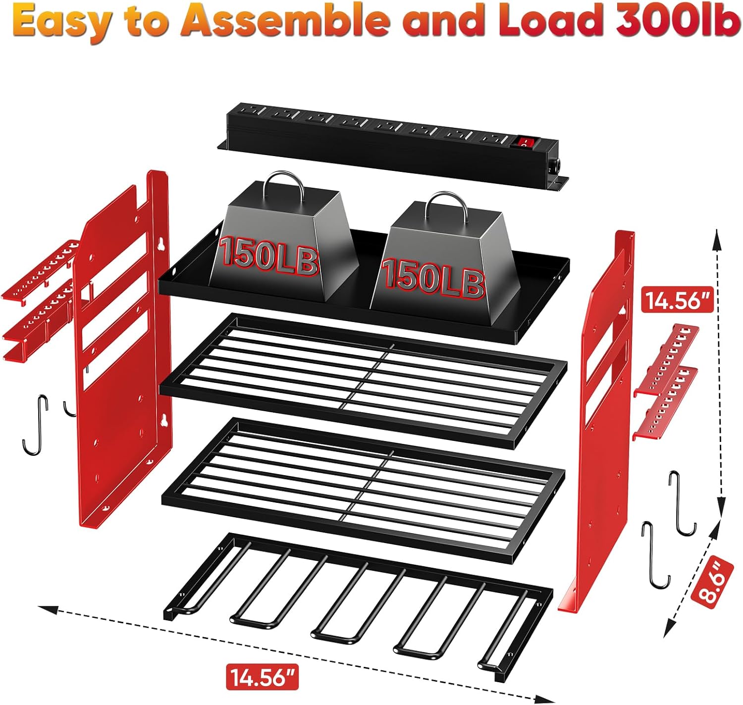 - 4-Tier Tool Rack Accommodates Most Tools:The wall-mounted tool storage rack with power strip features 2 Side Drill Bit Rack,4 Hooks, Two Shelves,8 Slots For Drills, and 8 outlets power strip. It can accommodate all your tools, including your charging station, batteries, toolbox, drill, hammer, Screwdriver, and other garage equipment, without any additional hassle. This organizer enhances your storage space significantly.