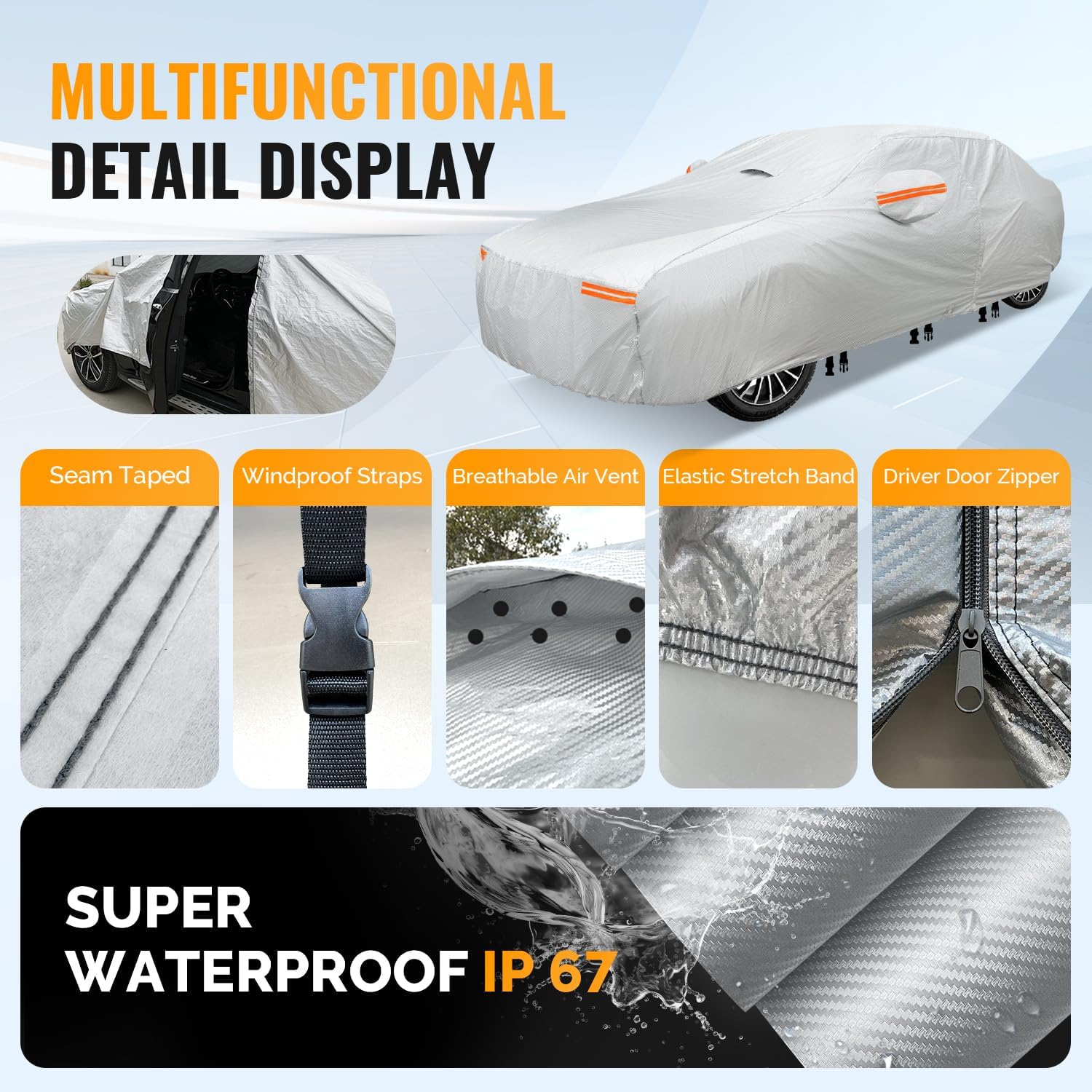 - The car cover is equipped with 3 windproof straps strategically placed around the cover for enhanced stability during strong winds.