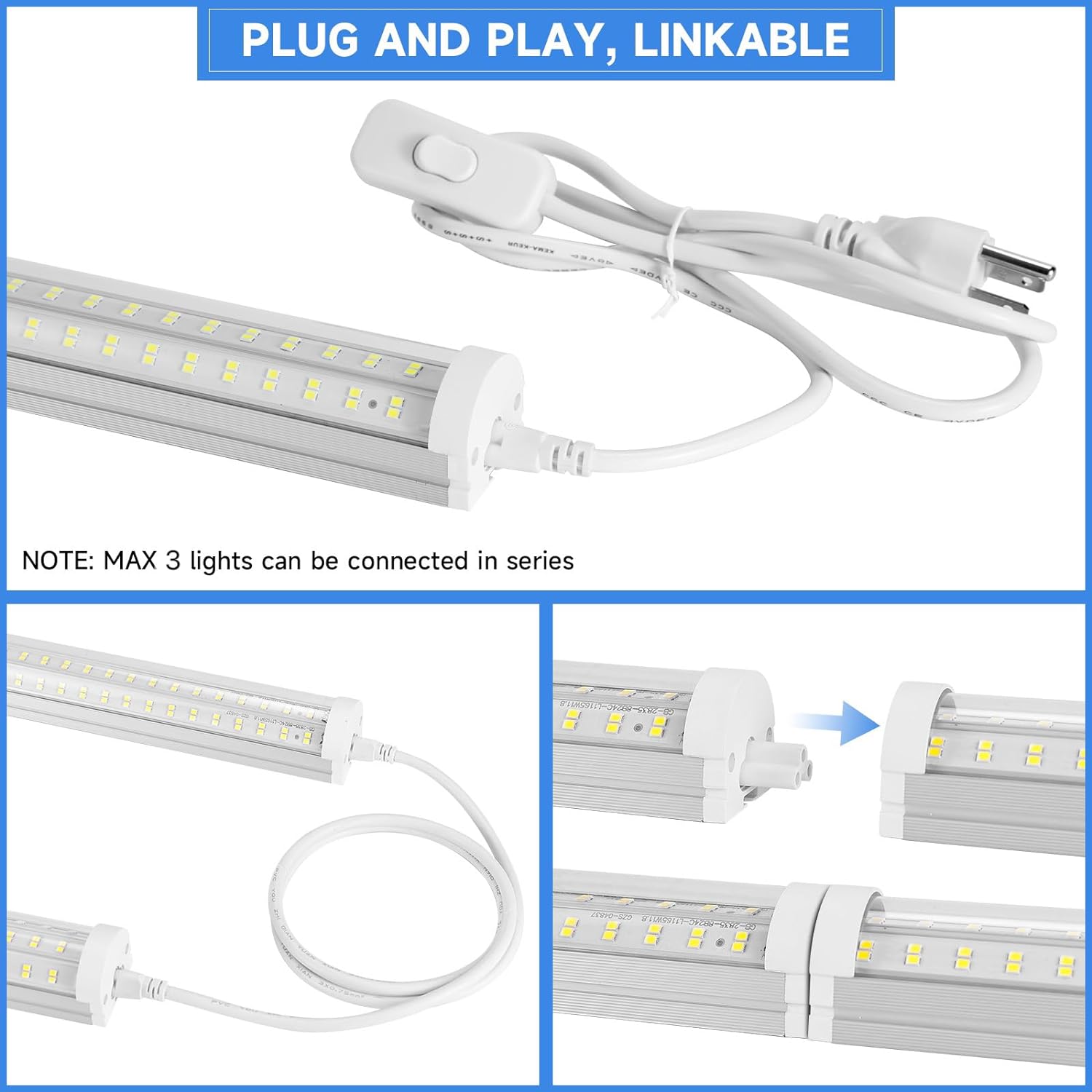 - 【Linkable & Humanized Design】-Our 8ft led shop lights are linkable and plug & play. You can connect up to 3 light fixtures and avoid the complicated wiring. The prolonged 59-inch power cords with an on/off switch is practical for you to install the light where you want.