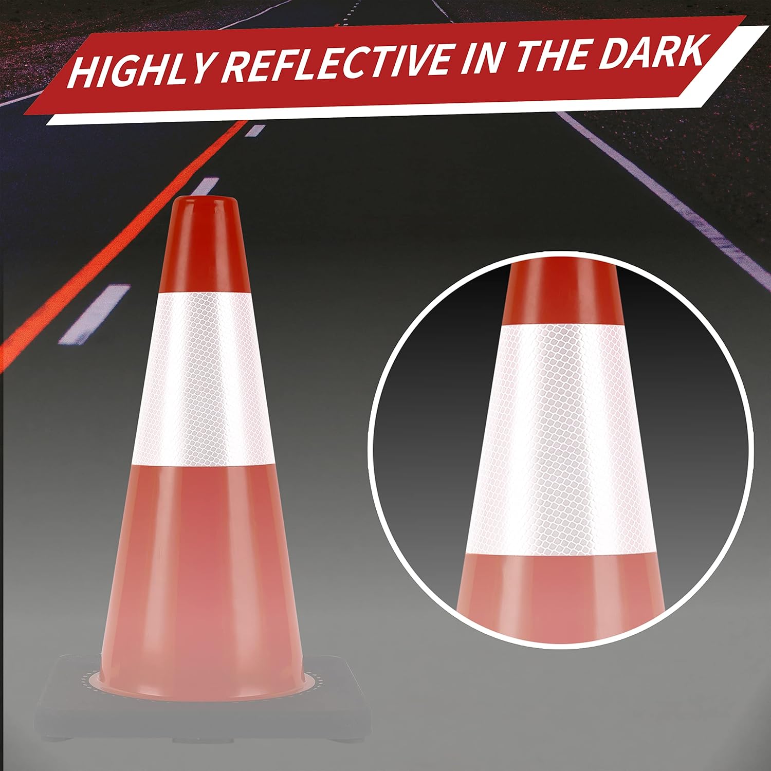 - EYE-CATCHING VISIBILIT: Our traffic cone features a combination of fluorescent orange and 6 -inch silver reflective strips. This makes them very noticeable day or night in sunny, fog, rain, snow, or other harsh conditions.