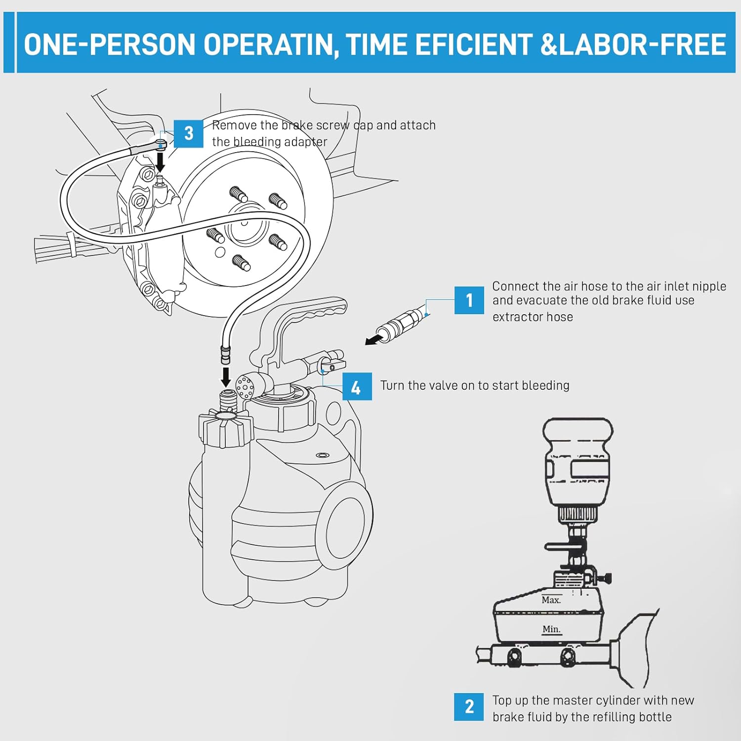 - [Single-Person Operation] The vacuum brake bleeder kit allows for easy bleeding and cleaning of hydraulic brakes and clutches without the need for additional personnel. You can effortlessly perform brake fluid, clutch fluid, and engine oil changes on your own, making it convenient and time-saving.