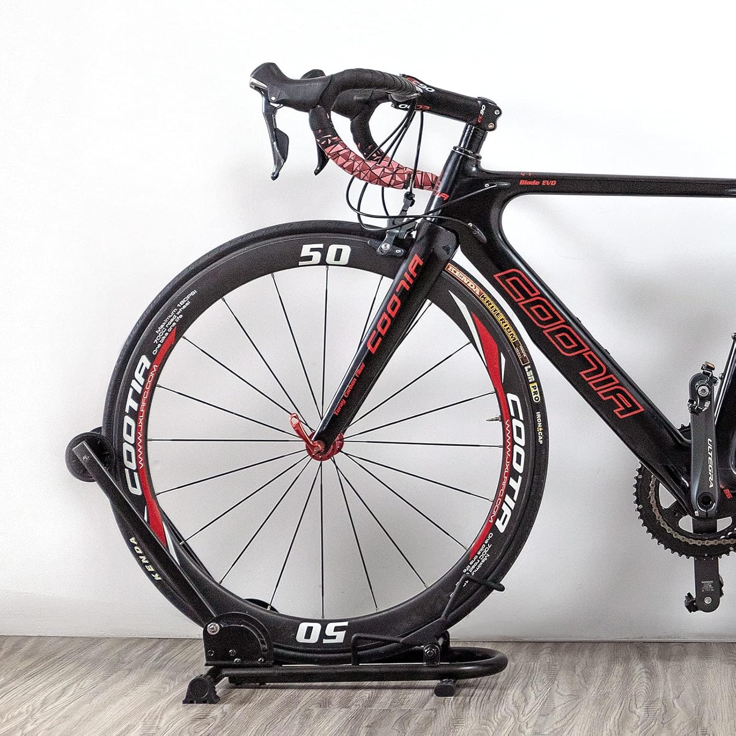 - 【FREESTANDING INDOOR BIKE RACK】: The collapsible bike stand uses an innovative spring-loaded three-point hold of the bicycle's wheel. You roll the front or rear wheel into the self-adapting lower cradle, and the spring-loaded arm locks around the tyre to give a secure three-point upright hold. It is a far better way of storing a bike than leaning it against a wall and it keeps delicate drivetrain and disc brake components away from potential knocks and drops.
