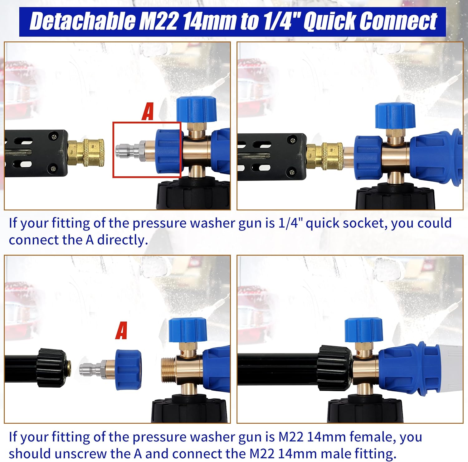 • EASY CONNECTION: Our snow foam cannon offers versatile connection options. You can connect it to a pressure washer gun using the detachable 1/4" quick connector. Simply remove the 1/4" quick connector to connect the foam cannon directly to a pressure washer gun with M22 14mm threads.