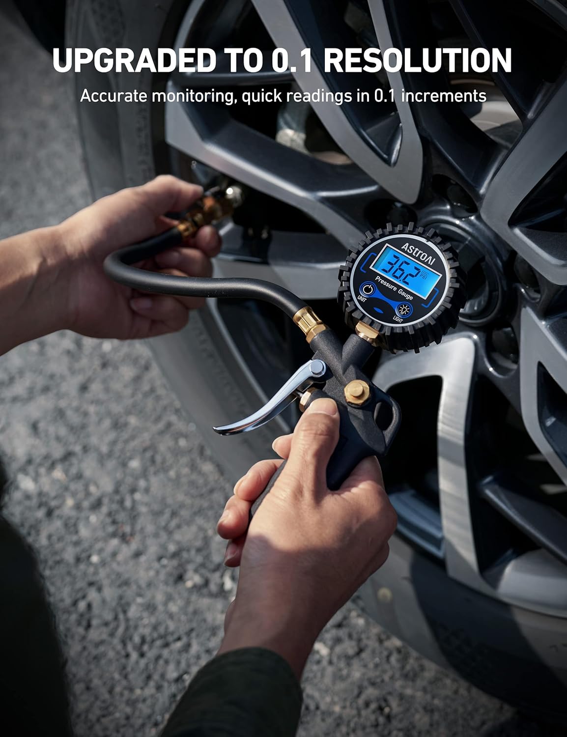 - ALL-IN-ONE FEATURES: AstroAI tire pressure gauge Includes an inflator, straight locking chuck, gauge, hose, and bleed valve, all in one unit with function of deflation, inflation, tire pressure check. Compatible with both ¼” and ½” NPT air compressors outputs.