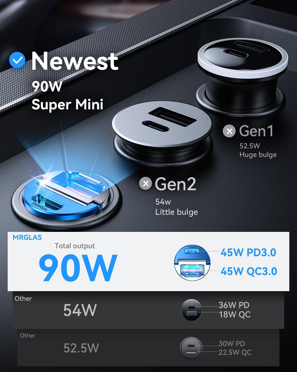 - OFFICIALLY APPROVED CHIP, AIM FOR FASTER & SAFER: MRGLAS fast car charger adapter Built-in PD45W&QC45W dual-core intelligent identification chip outputs 45W of fast charging current in each of its two cores, And the latest security control chip, which is a safe and high-speed Fast Car Charger without damaging the device