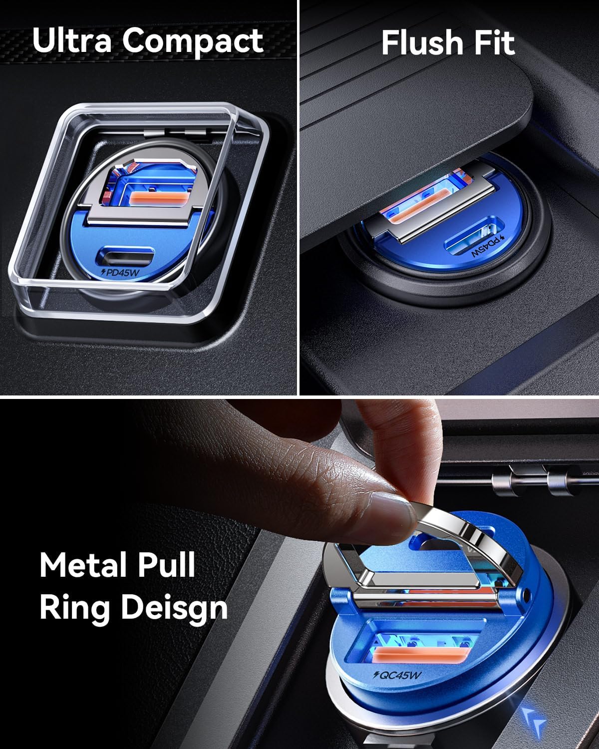 - THUMB-SIZED, PULL RING DESIGN: The smallest flawlessly cigarette lighter usb charger on the market until now. With a tiny-sized body, fits snug and flush into the lighter outlet does not protrude which perfectly hides in your cigarette lighter adapter. Never popup while driving and won't block the cover of the cigarette lighter. So we designed a pull-ring to help you unplug from the car cigarette lighter easier
