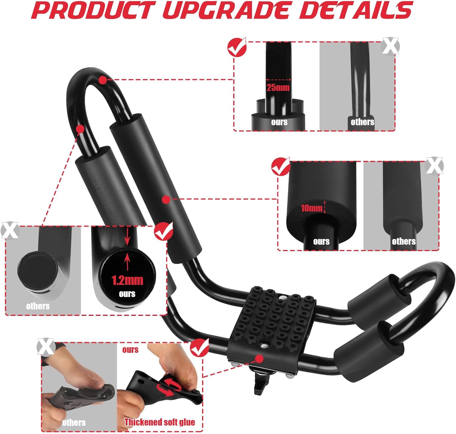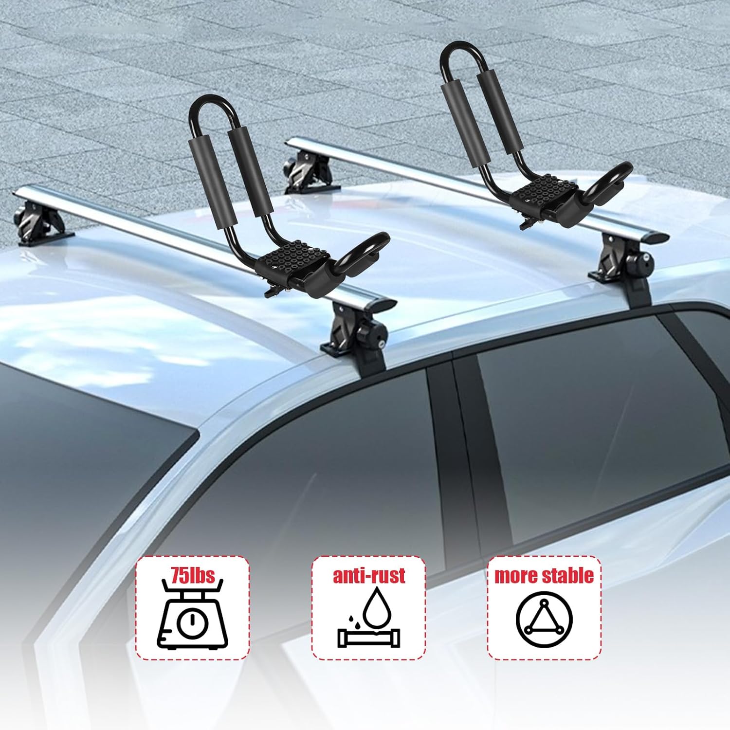 - 【Upgrade Thicken Design】Our kayak roof frames are made of high-strength carbon steel. The thickened tube wall (1.2mm) and diameter (25mm) make the roof frame stronger. The widened design can support a heavy kayaks up to 75lb. Rust-resistant and corrosion-resistant material features you can keep on the car roof for a long time