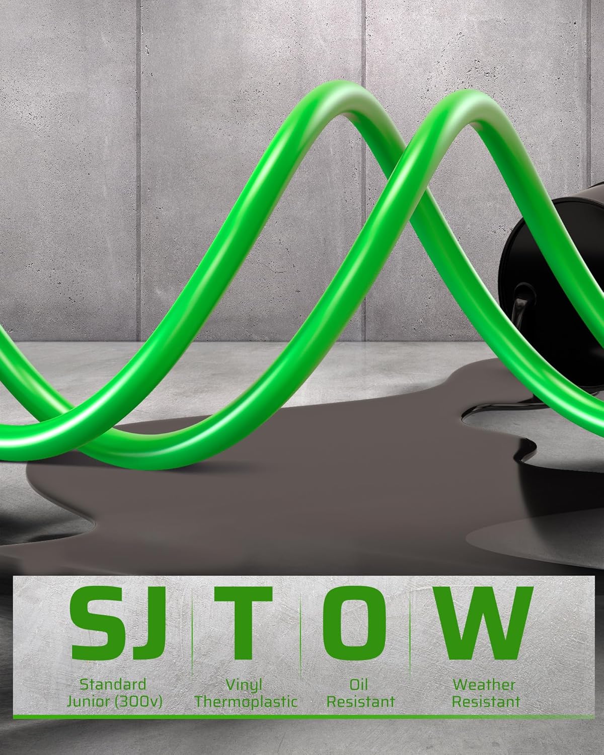 - [14 Gauge SJTOW Cord] The SJTOW electric cord reel, designed with a 14/3C gauge, durable and No breaking after repeated bending; weather-resistant and flexible in low temperature; resistant to UV rays, water, oil, and acid for use in typical garage; NOTE: Please use indoors or in a dry place