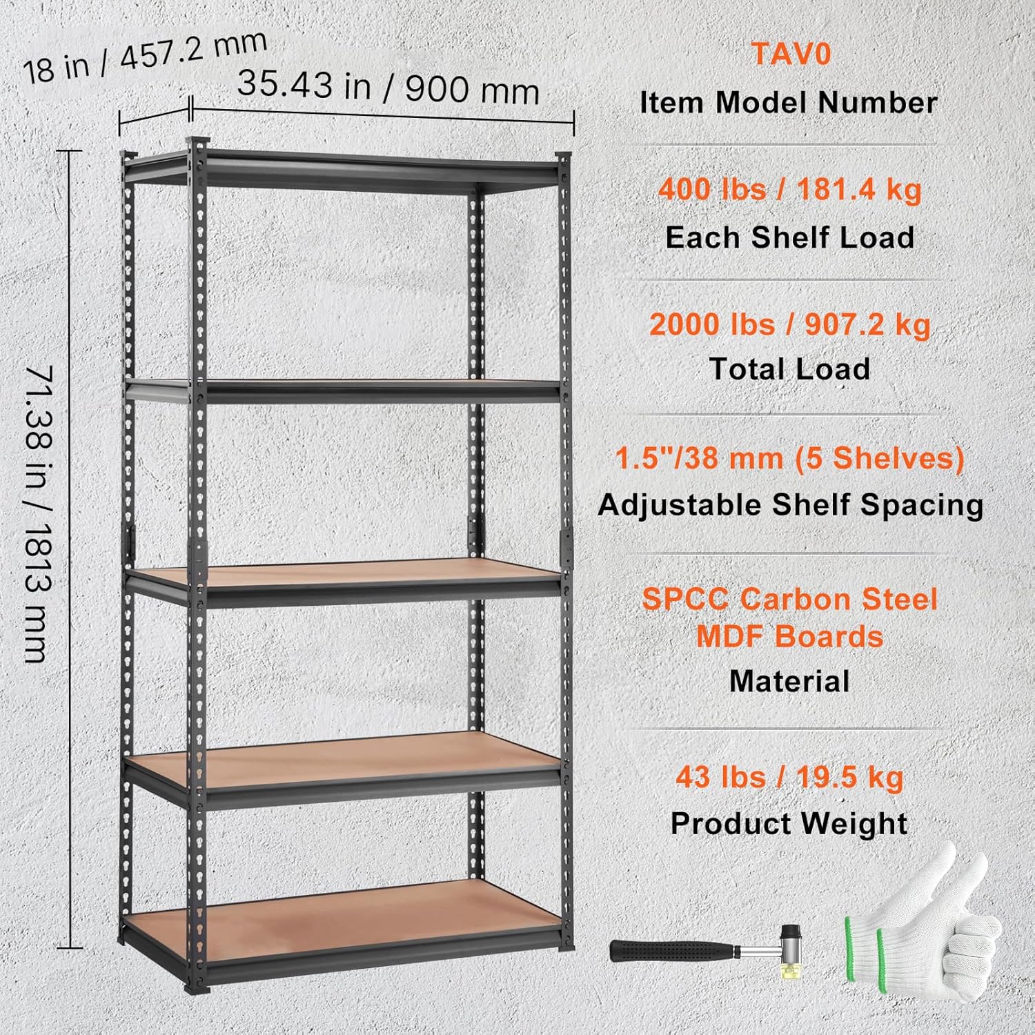 VEVOR Storage Shelving Unit, 5-Tier Adjustable, 2000 lbs Capacity, Heavy Duty Garage Shelves Metal Organizer Utility Rack, Black, 36" L x 18" W x 72" H for Kitchen Pantry Basement Bathroom Laundry