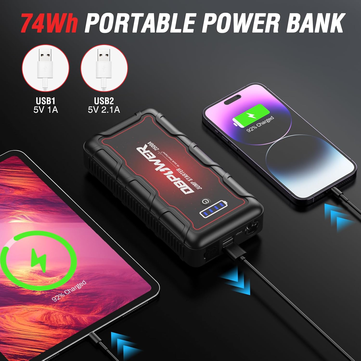 DBPOWER Jump Starter 2500A Peak 74Wh Portable Car Jump Starter (Up to 10L Gas/8L Diesel Engine) 12V Auto Battery Booster Pack with Smart Clamp Cables, Quick Charger, LED Light Jump Box