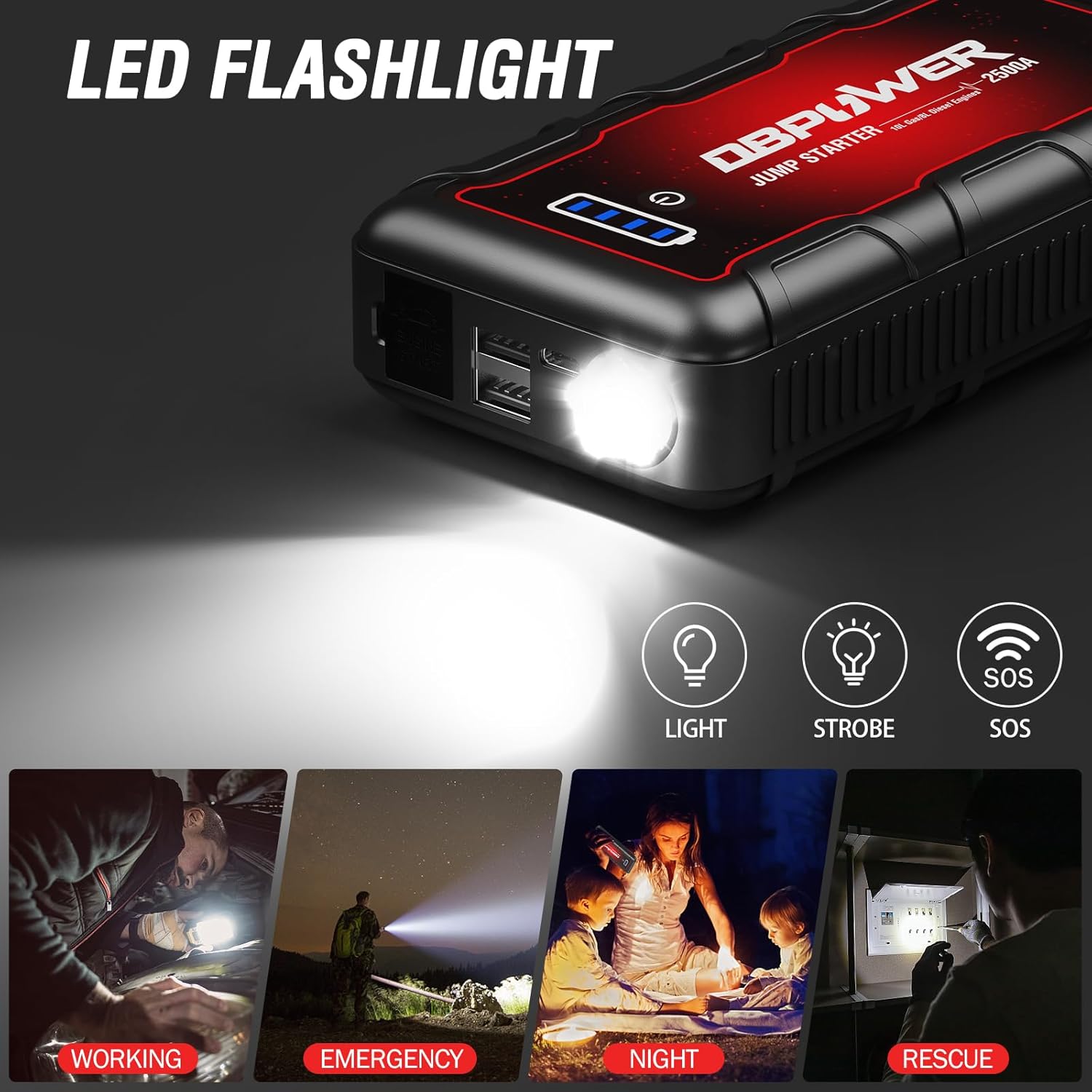 - 【 2500A JUMP STARTER 】 The DBPOWER G57 car jump starter provides up to 2500A peak current, it can start up to 10L gasoline engines and 8L diesel engines in just a few seconds. This lithium battery booster designed with heavy-duty clamps and cables, can quickly jump start all 12V dead car battery for up to 60 jump starts on a single charge. It is suitable for cars, trucks, motorcycles, boats, RVs, tractors, and more. You can easily and quickly solve problems by yourself!