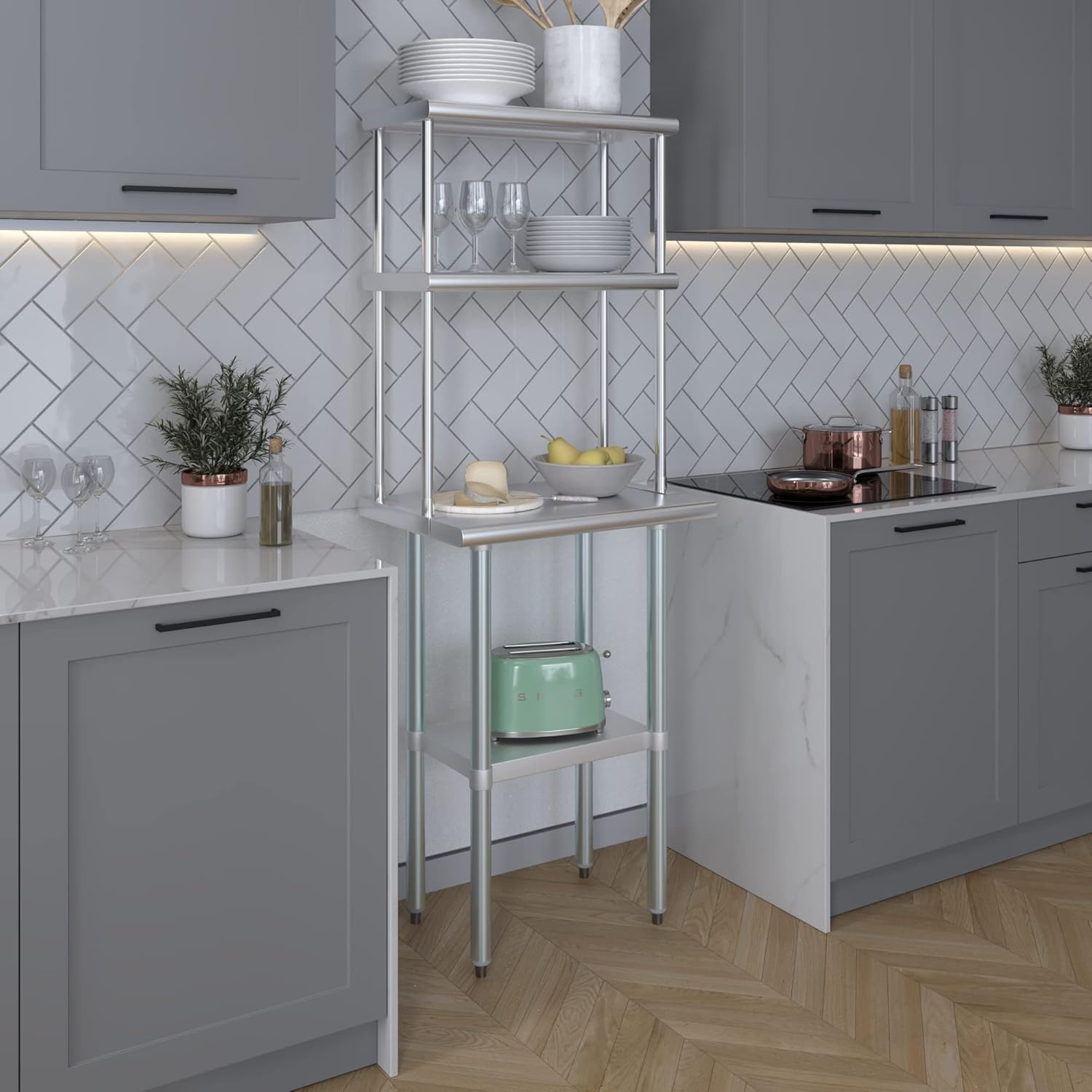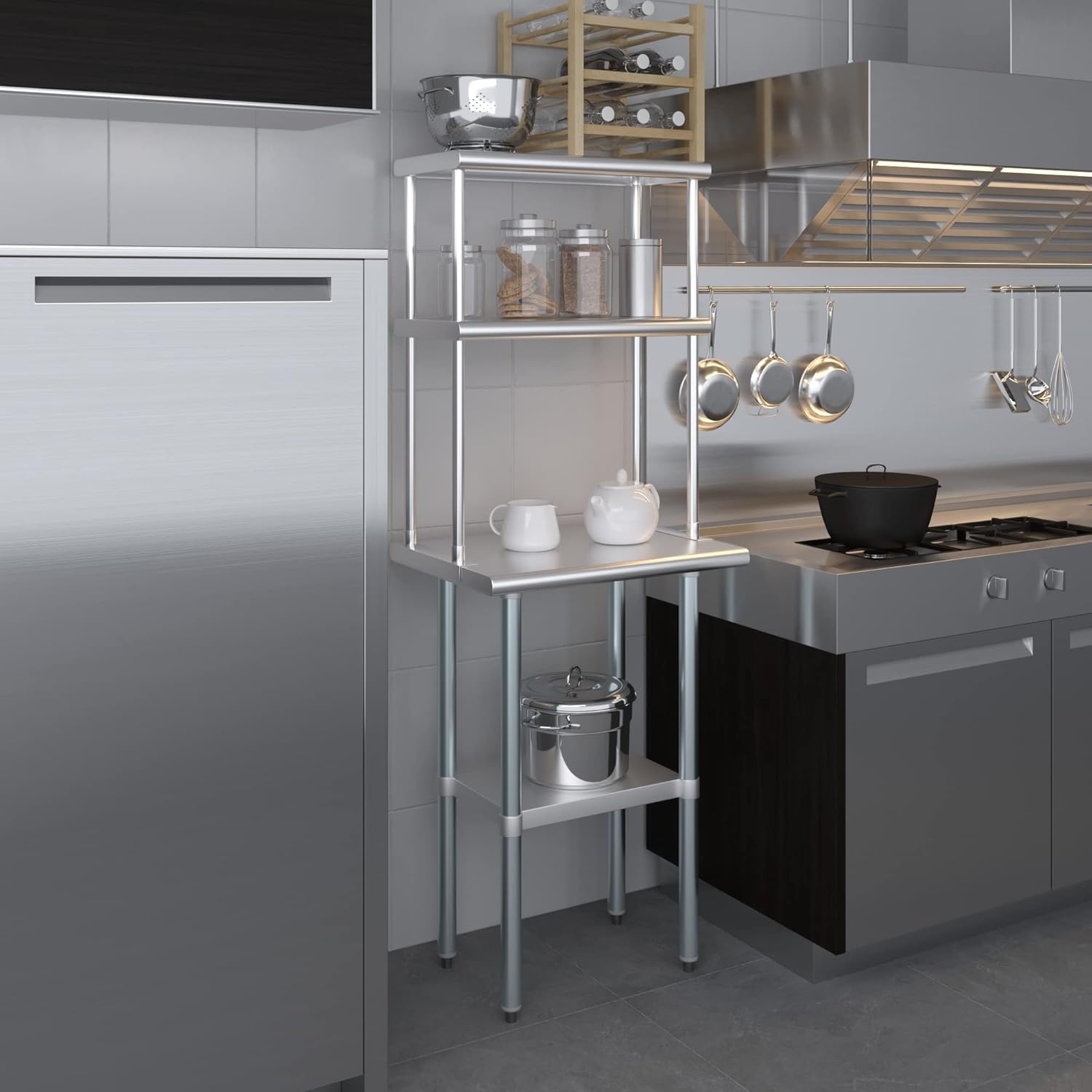 - WORK SAFETY: Work table top and double tier adjustable shelves are constructed from 18-gauge stainless steel, making this restaurant prep and serve table and double tier shelf combo set is durable and long lasting. The table top comes with a galvanized under-shelf for additional storage and adjustable legs for convenience. This table and shelf set is specifically designed and finished for use in a commercial or industrial setting, but is just as reliable in the home.