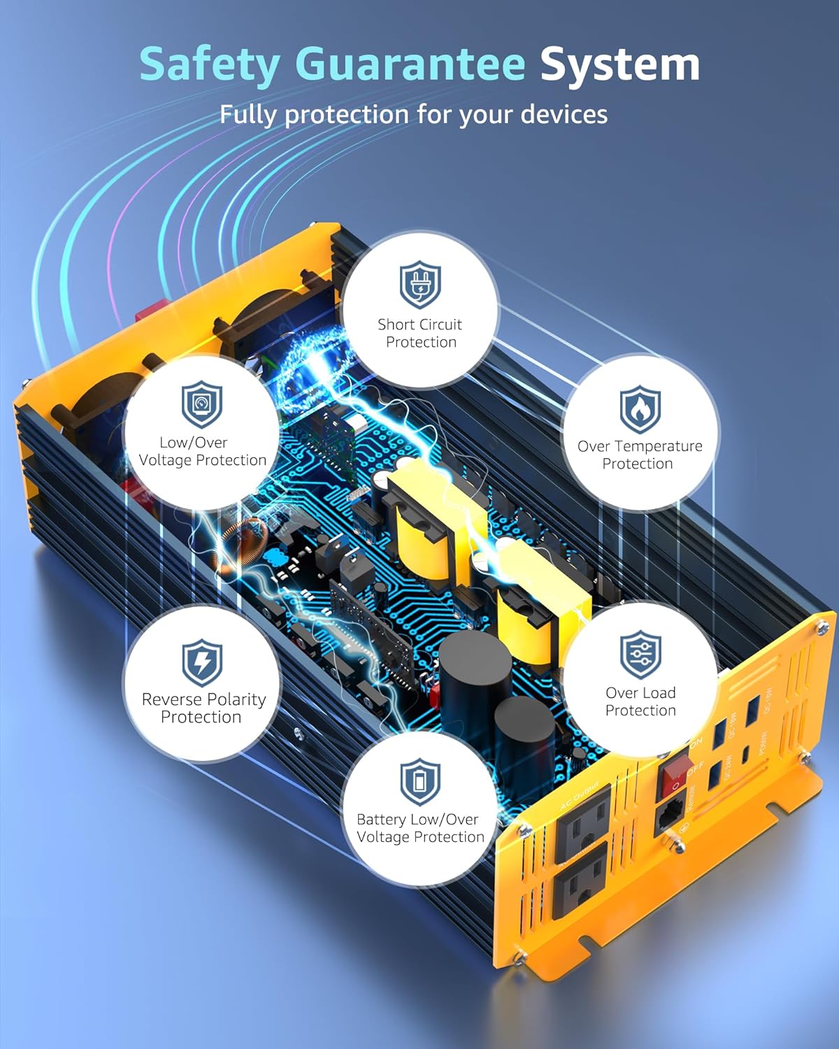 - 【FULLY SAFETY PROTECTIONS】 Pure sine wave inverter has passed FCC CE ROHS PSE certification. Designed with isolated input/output stable design offers under-voltage protection, overvoltage protection, overload protection, overheating protection, and short circuit protection to ensure safety.