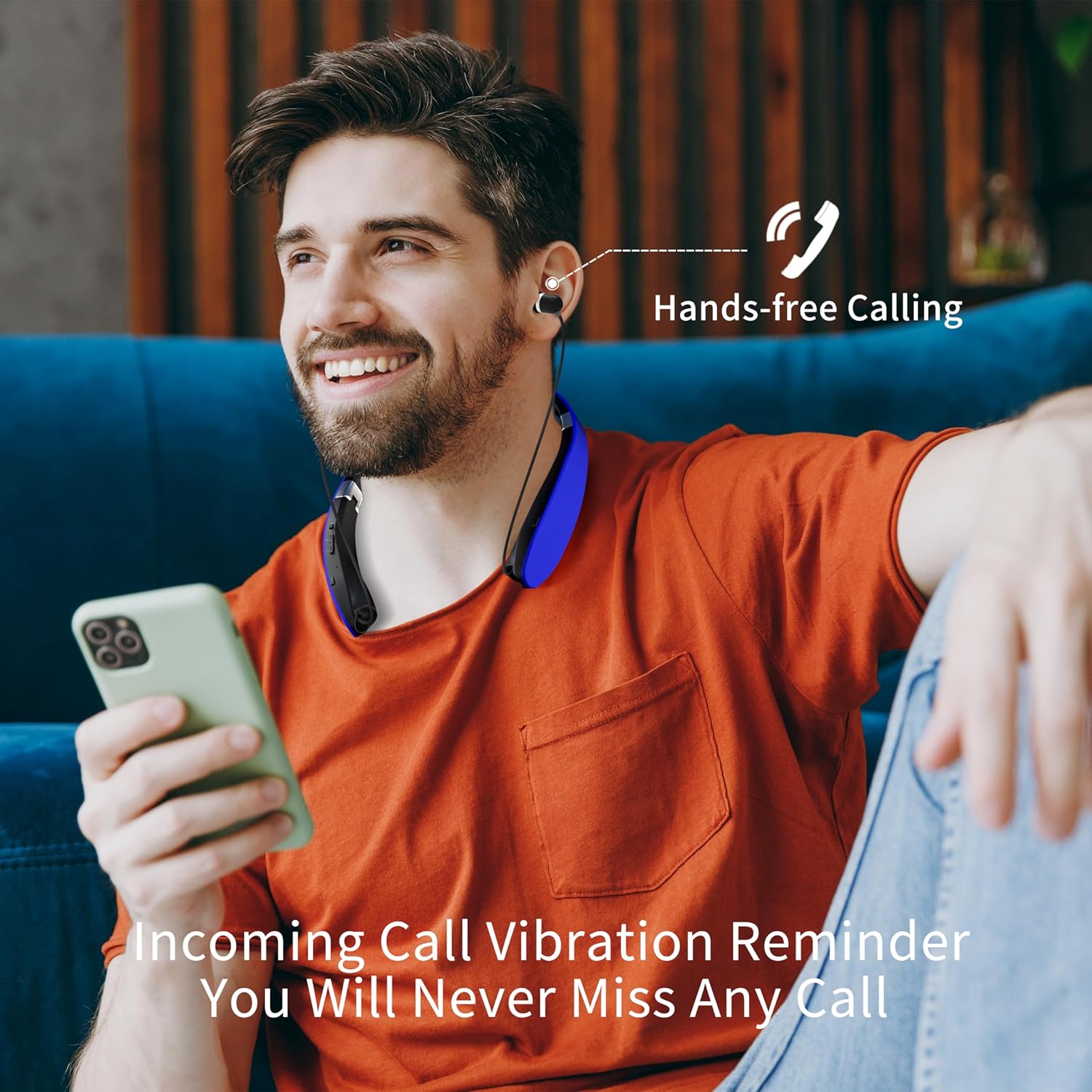 AMORNO Foldable Bluetooth Headphones Wireless Neckband Headset with Retractable Earbuds, Sports Sweatproof Noise Cancelling Stereo Earphones with Mic (Blue)