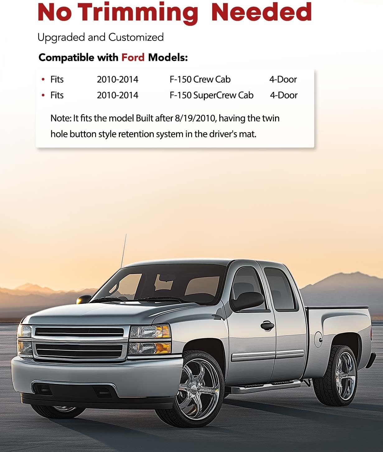 - Perfect Fitment: YHTAUTO floor mats are custom-designed to Compatible with Ford F-150 2010-2014 Crew Cab/Super Crew 4 Full-Size Door; It fits the model Built after 8/19/2010. Keeping your interior clean. Provide comfort and protection in any season in your every trip