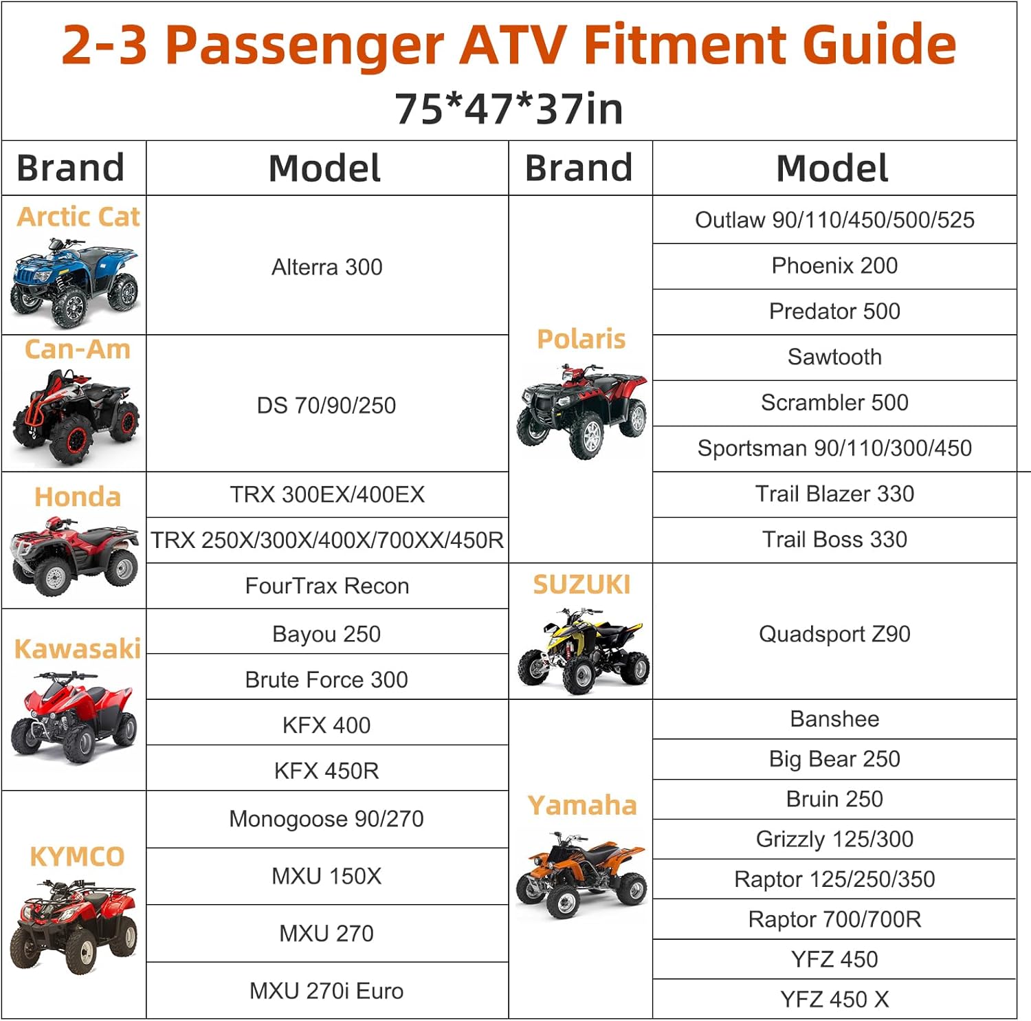 - 【Universal four wheeler Models】:The cover size - 75"L x 47"W x 37"H fit for most ATV, suit for Arctic Cat, Can-am, Honda, Kymco, Polaris, Suzuki, Yamaha ATV and more(To ensure the right size, please measure your ATV before purchasing)
