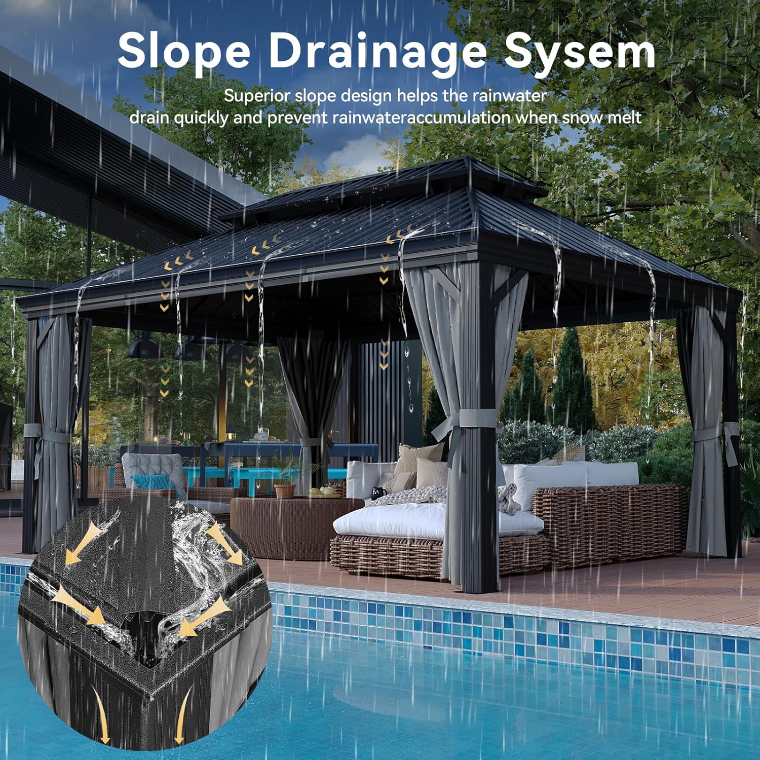 - Galvanized Steel Top and Water Gutter Design:Selection of powder-coated galvanized steel top, this hardtop gazebo is durable and sturdy enough to endure bad weathers. The professional drainage system enables water to flow from the edge of the gazebo top into the pole and the ground, greatly reducing the troubles of rain or snow accumulation