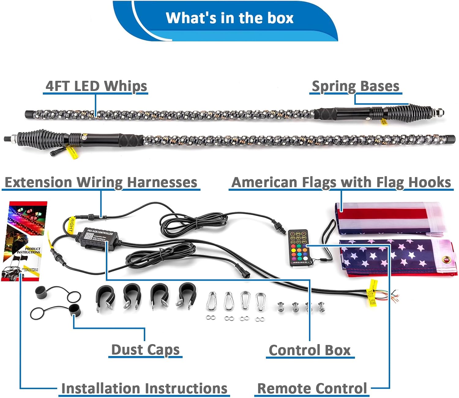 - [Installation & Package] - Easy to use, our RGB LED Whip Light is a plug-and-play design with a quick-release base, no modification is required. Package Includes 2 x 4FT LED Whips,2 x Spring Bases,2 x American Flags(with flag hooks),2 x Dust Caps,2 x extension wiring harnesses,1 x Controller,1 x Control Box,1 x Installation Instructions. With a cell phone or a control box, you can control both the whip lights, rock lights or RGB led light bars at the same time and realize the same frequency