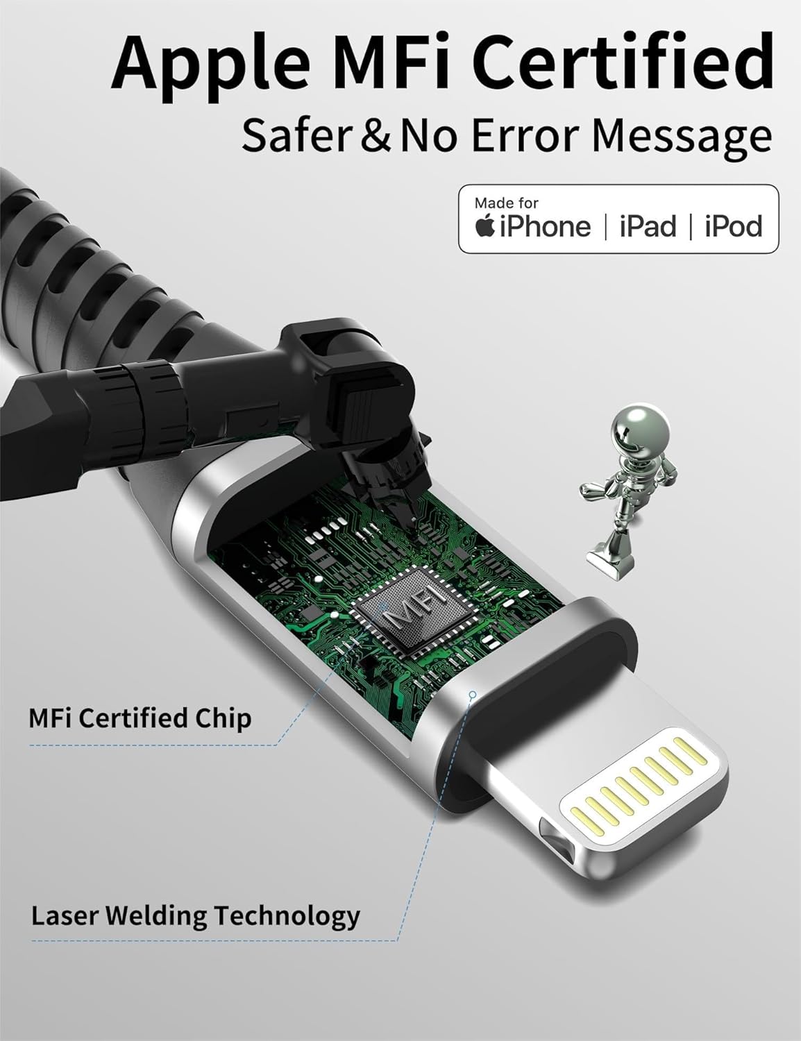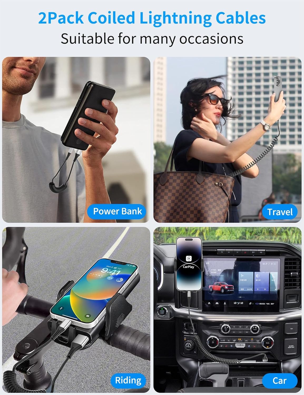 - 【MFi Certified & Support CarPlay】Each Coiled Apple Charger Cable is built-in with an Apple original chipset to ensure 100% compatibility with your iPhone, and be able to connect to the vehicles’computer to initiate Apple CarPlay effortlessly.