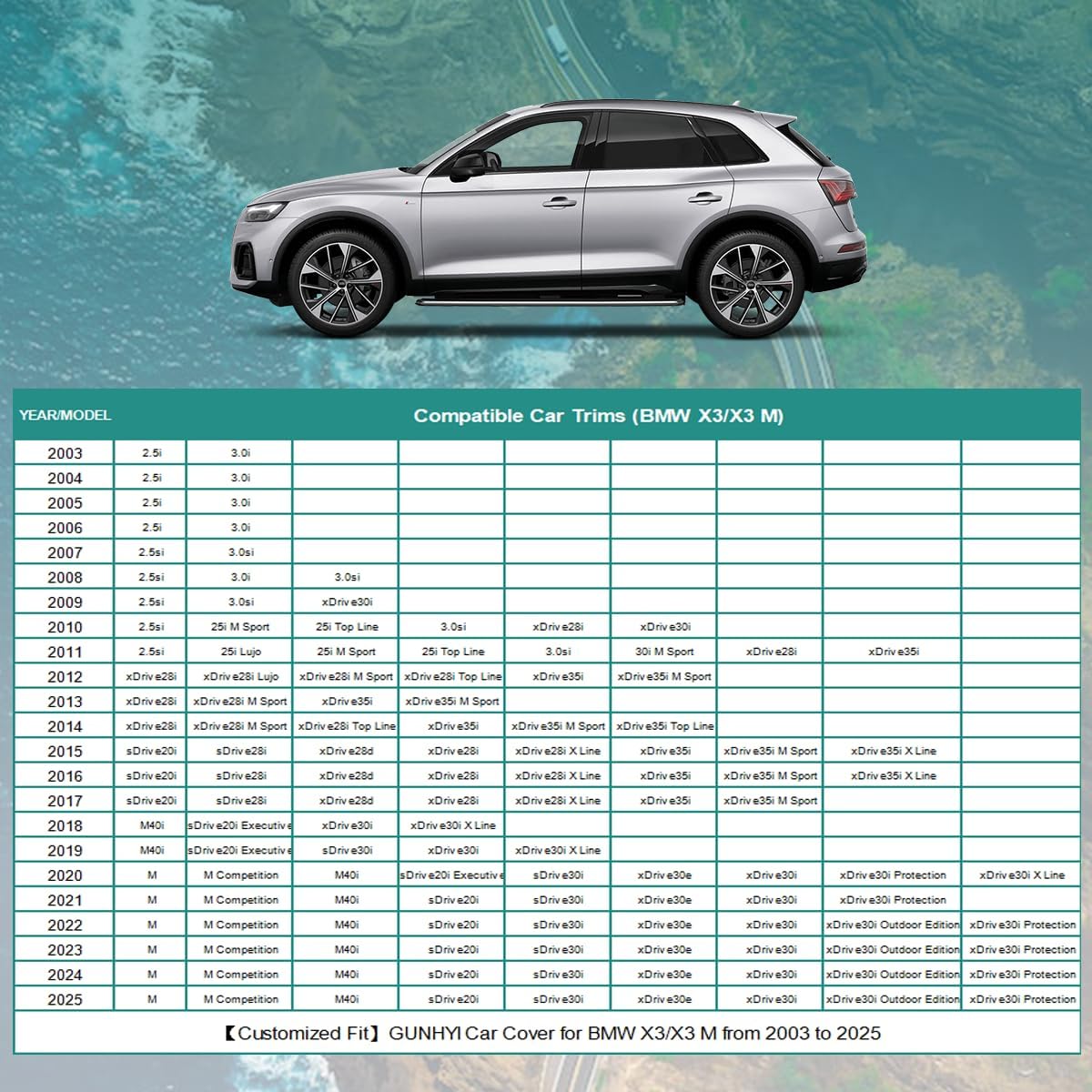 - 【Compatible with】This Full Car Cover Custom fit for BMW X3/X3 M from 2003 to 2025. Comes with a microfiber towel that you can use to clean your car, because if there is sand on the surface of the car before use, it may damage the paint.