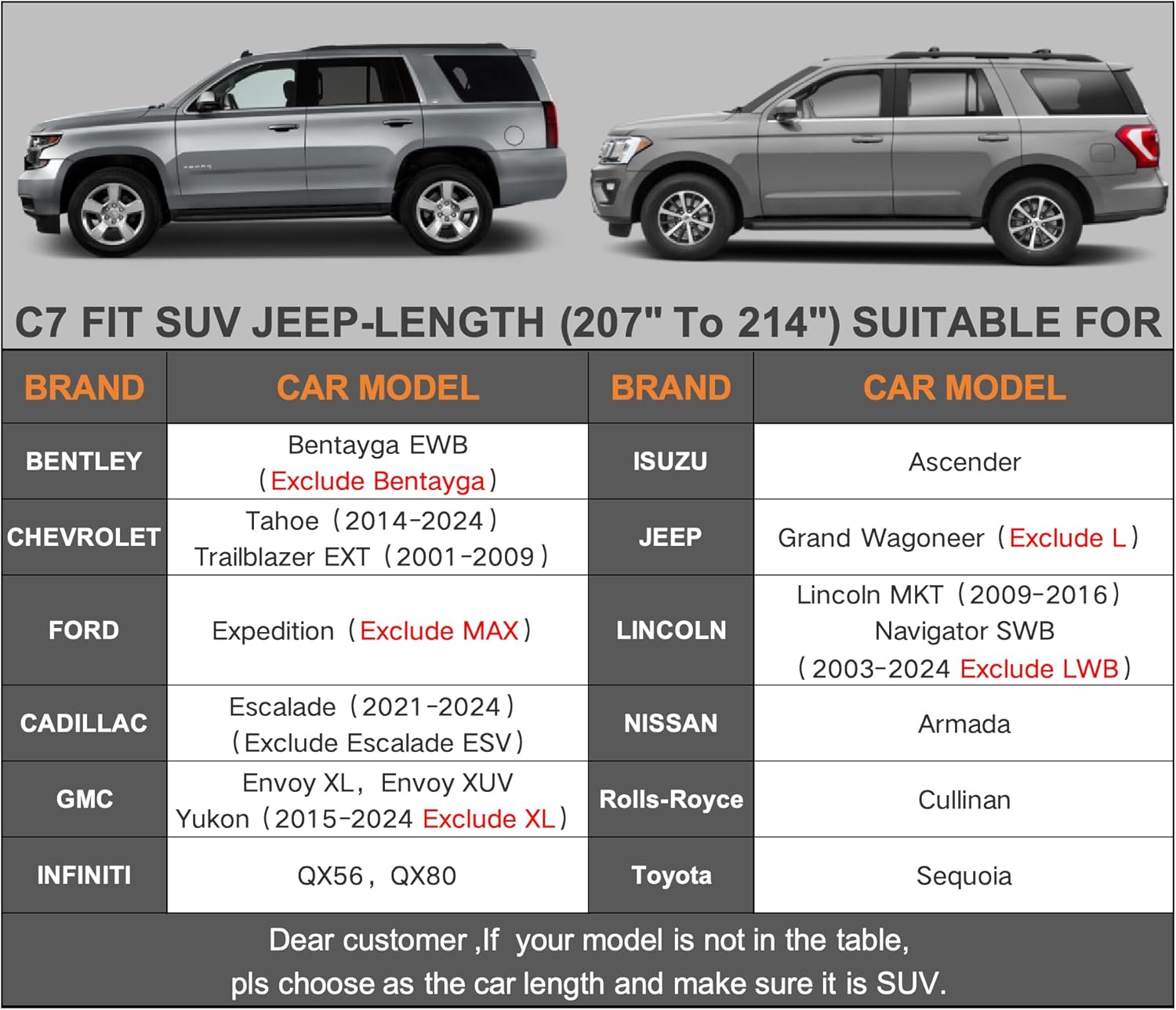 - 【Dimension C7】Universal fit for Suv which length is 207-214 inch (Not for hatchback and sedan). Suitable for Chevrolet Tahoe, Lincoln MKT, GMC Envoy etc.