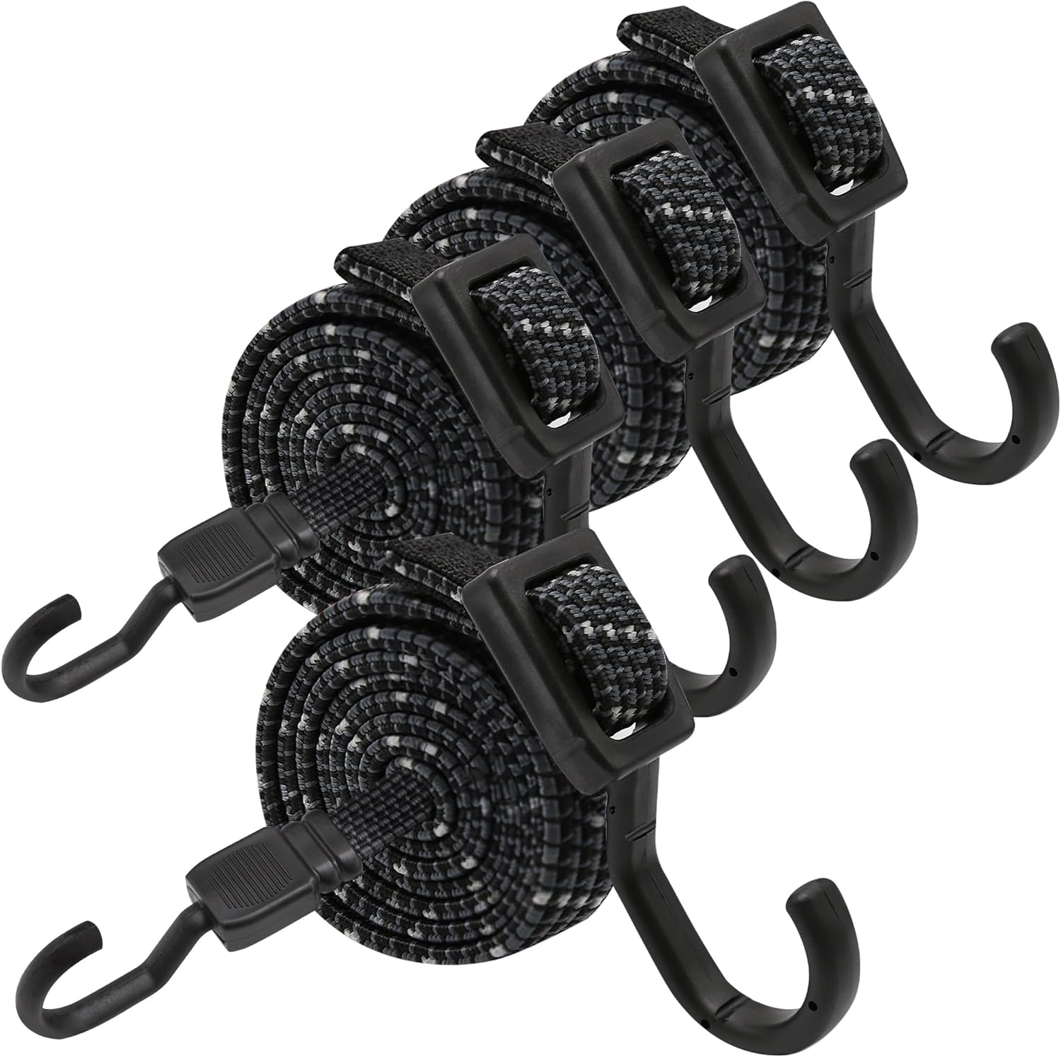 - Multifunctional bungee straps: These black bungee cords with hooks are widely used in all kinds of occasions indoor and outdoor, such as bike rack, bicycles, cars, clotheslines, tent poles, roof racks, trailers, canoeing, kayaking, securing camps, tents, tarps,and more. Beyond the obvious applications of securing heavy loads to the roof of a car or bed of a truck, they are also helpful for keeping luggage, tools, and other things reliably in place.