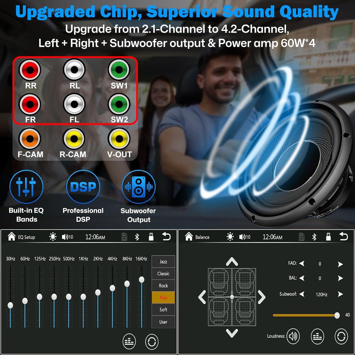 - 【4.2-Channel Audio Output, 60W*4】This car radio supports 4 Channels RCA Audio Out for Connecting to Aftermarket Amplifier and 2 Separate Subwoofer Out, with max 240W output, FR, FL, RR, RL, adjusting music effect wherever position. You can enjoy the outstanding sound quality and breathtaking bass effects. Perfect for music enthusiasts and drivers who enjoy music in your cars