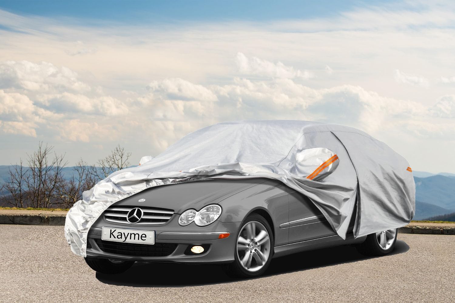 - 【Premium Material】-Kayme 6 layers car cover is made of heavy duty material. 1 PE&PEVA is 100% waterproof, It's great for rainproof snowproofing. 2 High reflective aluminum is good at sunproof and anti-uv, Keep the car cool in the summer. 3 Thicker and soft cotton will protect vehicle painting. Kayme multi-layer material is much thicker and more durable than other similar products.