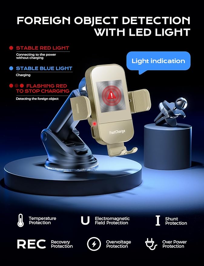 - 【Foreign Object Detection With Led Alarm】Our wireless car phone charger prioritizes your phone's safety. If a metal substance is detected between the charger mount and your phone, it immediately stops charging and flashes a red light to alert you. This innovative feature effectively prevents damage caused by metal-induced high temperatures.