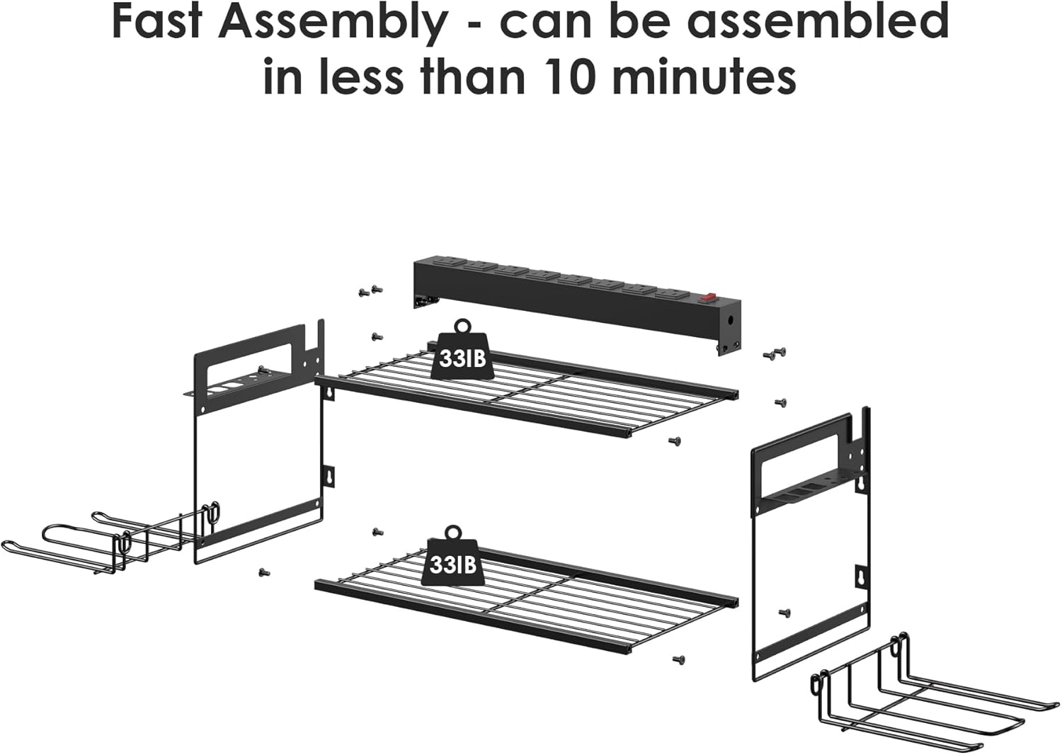 - Very convenient for charging your tool batteries, All-in-one design and the metal power strip with surge protection of 1200J, Able to protect your device to a certain extent, output: 125V/15A/1875W. Utility rack size: L:30.9in * W:16.9in * H:9.37in.