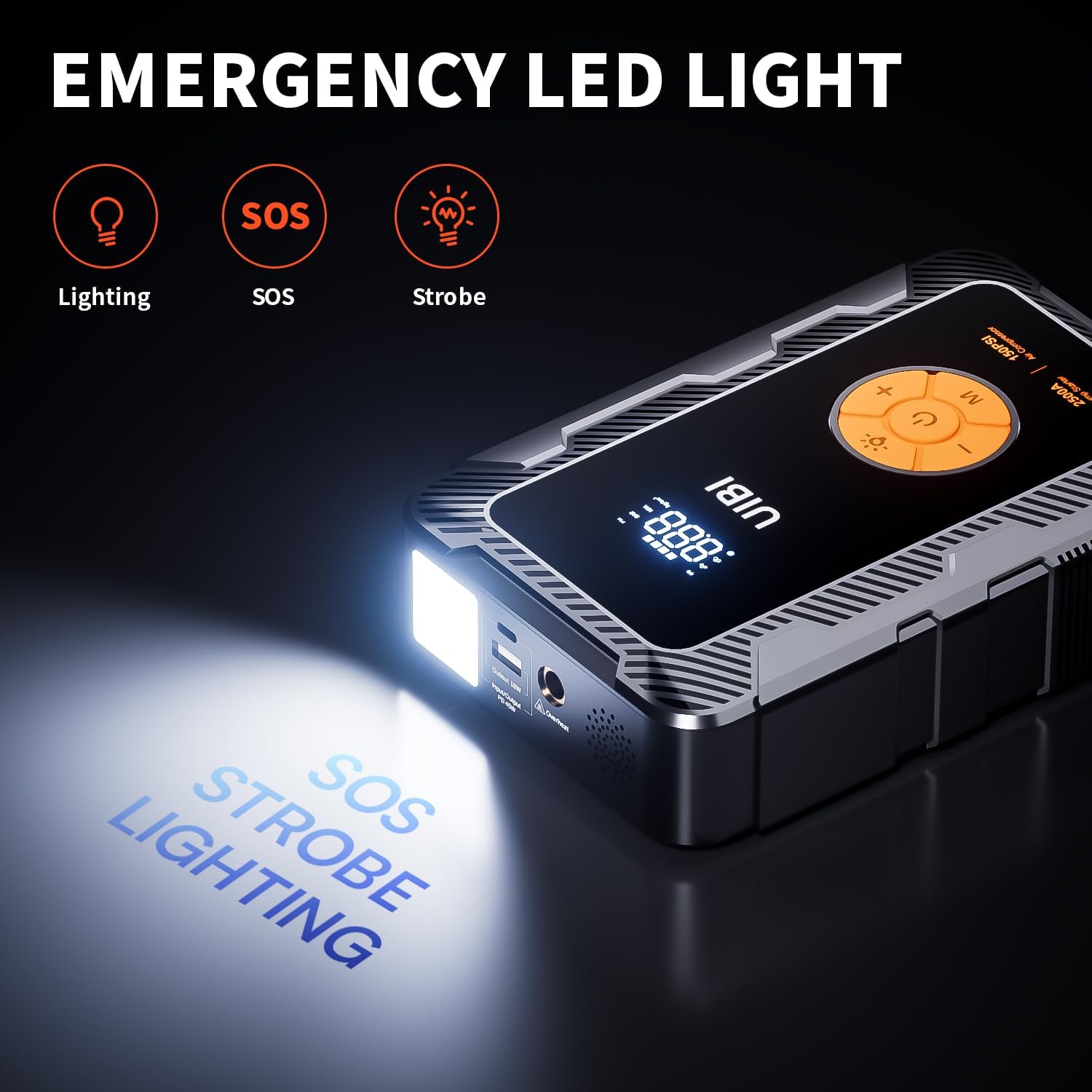 - 【Emergency Light & Portable Power Bank】 The widened design LED light of this jump starter battery pack supports 3 modes: flashlight, SOS and strobe. UIBI car battery charger jump starter is also a power bank that can quickly charge your iPhone, iPad, laptop and other USB devices anytime and anywhere. Friendly design of bidirectional Type-C and USB-A output ports, which supports simultaneously charging 2 USB devices. It's perfect for outdoor adventures and road trips, etc
