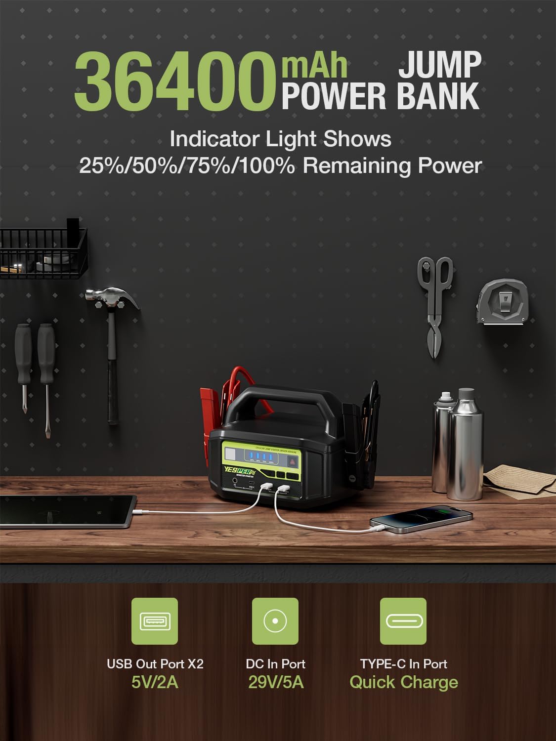 - [Powerful Jump Starter] - YESPER’s latest upgraded heavy duty 12V/24V jump starter with 6000 Amps peak cranking amp (for ALL Gas and Diesel engines); Can automatically identify 12V and 24V cars and switch the starting voltage; up to 65 jump starts on a single charge
