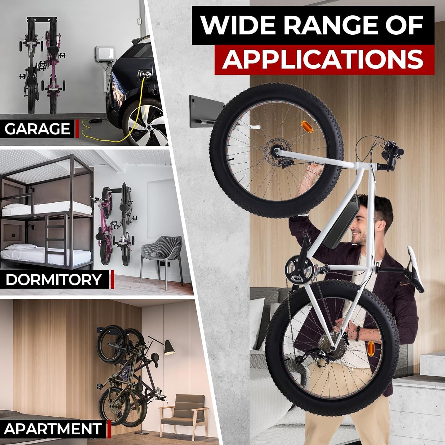 - SPACE SAVER : Using the fat tire bike storage rack for the garage allows you to free up more space,enabling your fat tire mountain/electric bike to be stored vertically and ensuring that your bikes won't occupy floor space