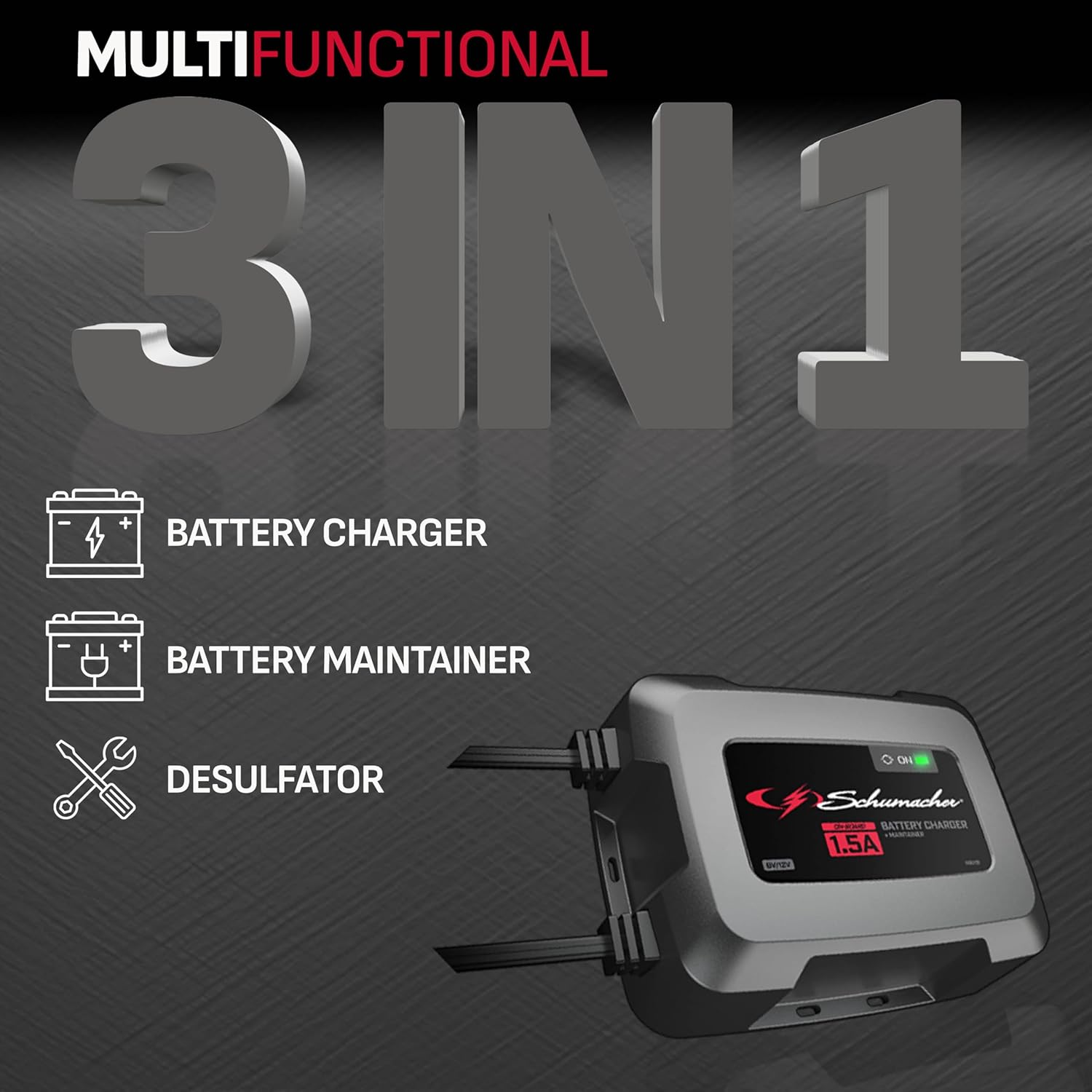 - Complete Package - Schumacher Electric SC1587 3-in-1 1.5 Amp 6 Volt and 12 Volt On-Board Battery Charger and Maintainer and user manual