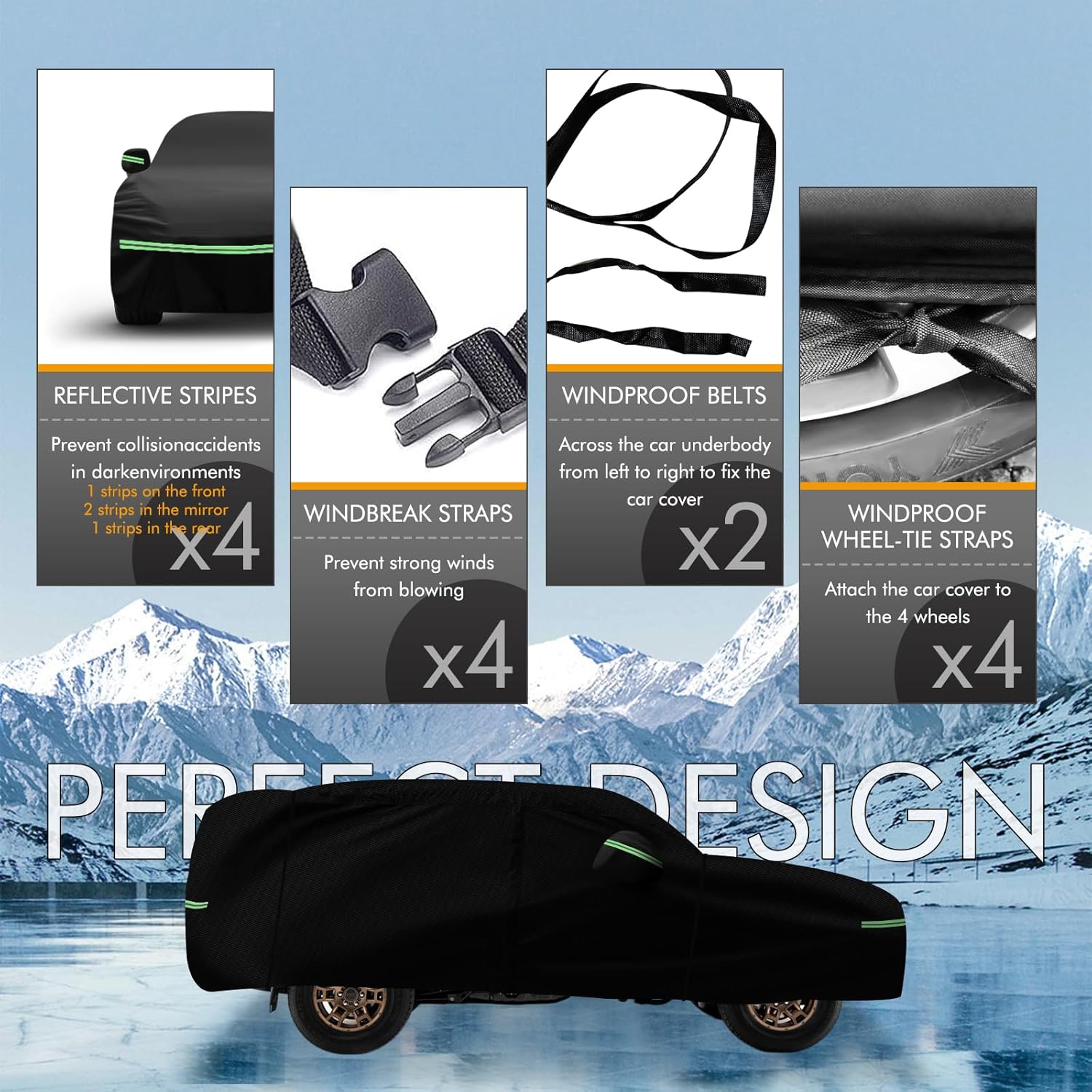 - đăUpgrade Windproof Designăâ A windproof fixed buckle pass through the middle of the car for easy fixing; âĄWindproof belts at the front and rear; â˘4 straps to tie the cover to the four wheels; âŁElastic band at the bottom can easily adjust the size of the cover; â¤Double stitching ensures that the cover will not tear easily, making it more durable; âĽThe included safety latch secures the cover. Multiple upgraded designs keep your protective cover from being blown away even in strong winds.