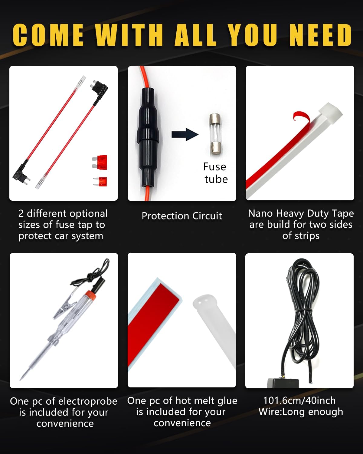 - Special Feature : Package includes one test pencil,one hot melt glue stick., Soft & Bright Light ,No Dark Spots, Two sides of Strip are Build with heavy duty Nano Tape, With 40 inches wire, With Fuse Tap Adapters for protection circuit Package includes one test pencil,one hot melt glue stick., Soft & Bright Light ,No Dark Spots, Two sides of Strip are Build with heavy duty Nano Tape, With 40 inches wire, With Fuse… See more