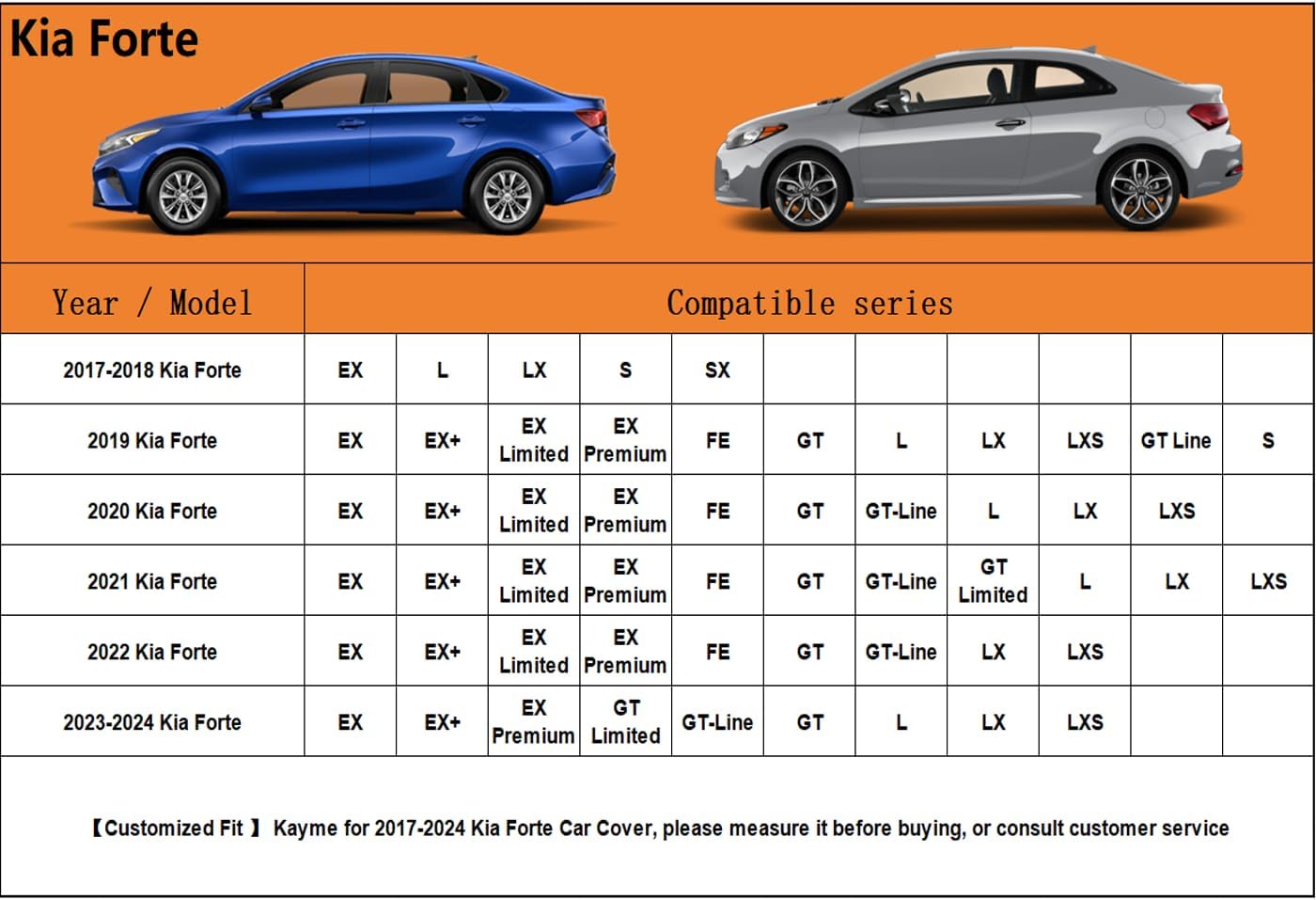 - 【Suitable for】— Custom fit for Kia Forte (2017-2025). Come with a large enough portable bag to store your cover when you do not use