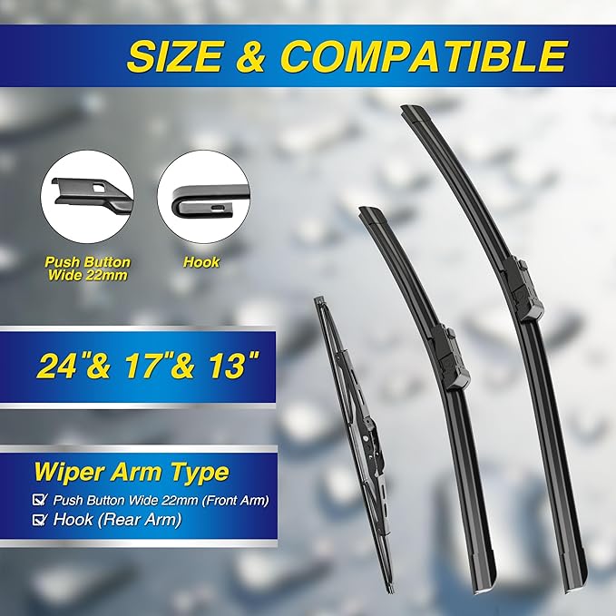 - 【Product Details】Driver & passenger & rear(set of 3 ):24"+17"+13" Windshield Wiper Blades (Not Fit For U/J Hook Front Wiper Arm)
