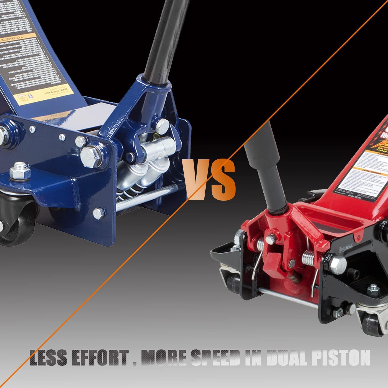 - SECURITY - Built in safety value provides overload protection, preventing user injury and jack damage, superior safety PERFORMANCE: Dual piston quick lift pump allows you to easily raise the jack to the desired height. Within 2 year warranty period.