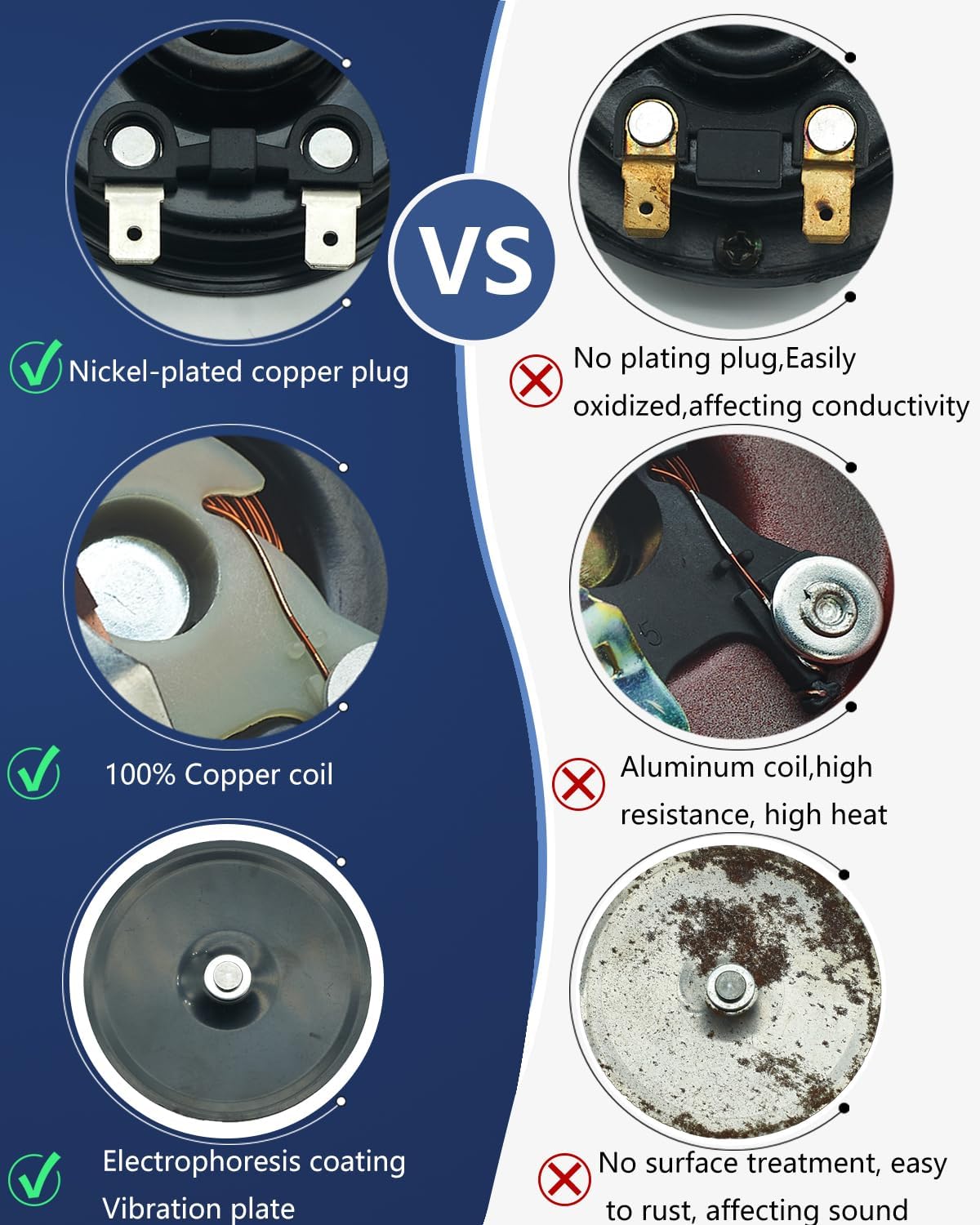 - Quality Material: The 12v horn is powered by copper coil, which is good conductivity for low heat, ensure stable sound and long lifespan, no more frequent replacement