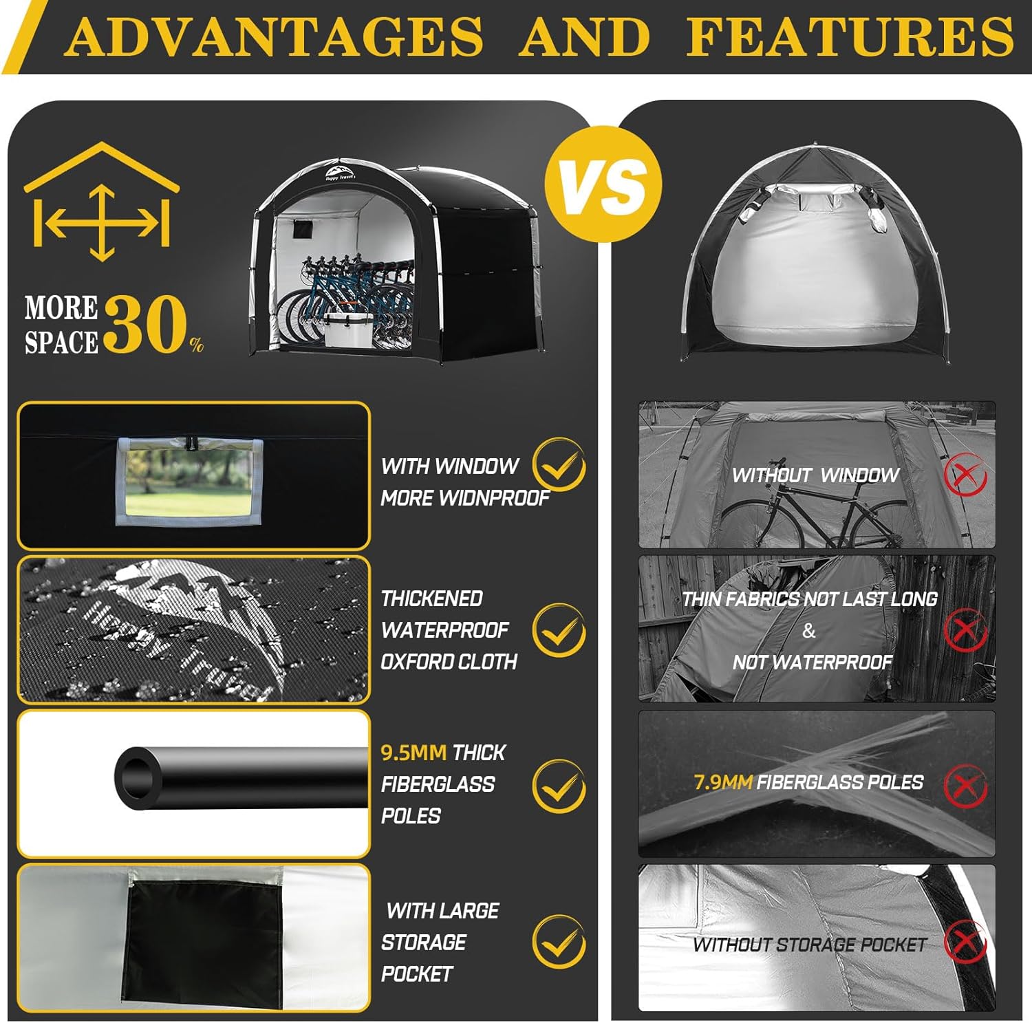 - 【Superior Protection】The bike tent outdoor storage waterproof is made of 210D Oxford cloth coated with silver and the stitch of the bike & motorcycle shed are all covered with waterproof tape,which provides excellent waterproof. Our garden shed adopts 9mm thick fiberglass poles make the whole framework stronger.And the bicycle shed is equipped with stakes,so that you can rest easily on rainy days, heavy snow and other weather.