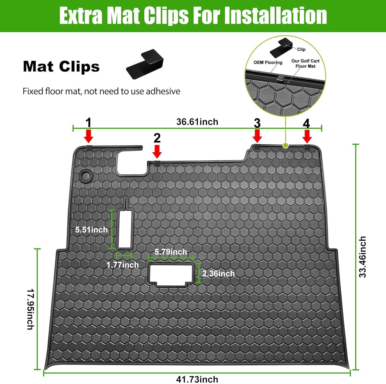 - Accurate size: Laser-measured, EZGO floor mat fits around pedals and seat base, does not interfere with brake pedal and accelerator, just use four clips that attach to the factory installed mat, not need to use adhesive to stay in place, easy to install and remove