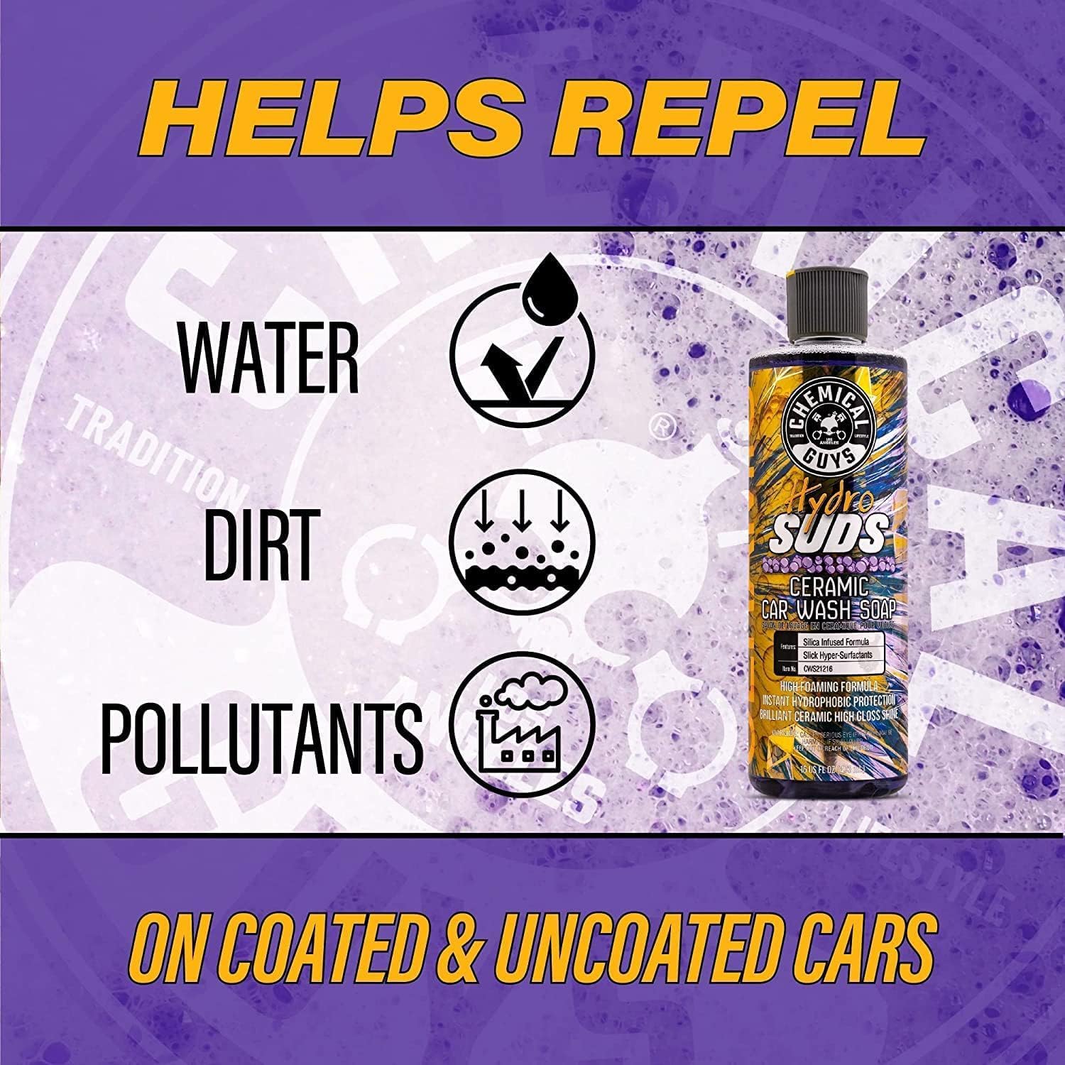 - SILICA-RICH FORMULA - HydroSuds is infused with nano SiO2 that leave behind ceramic protection and incredible gloss. HydroSuds offers a good level of protection alone, leaving a silica-rich film behind that helps repel water, dirt, and other grime, keeping your car cleaner...longer. Use it on a non-coated car to add water beading properties or on a coated car to revitalize your ceramic coating!