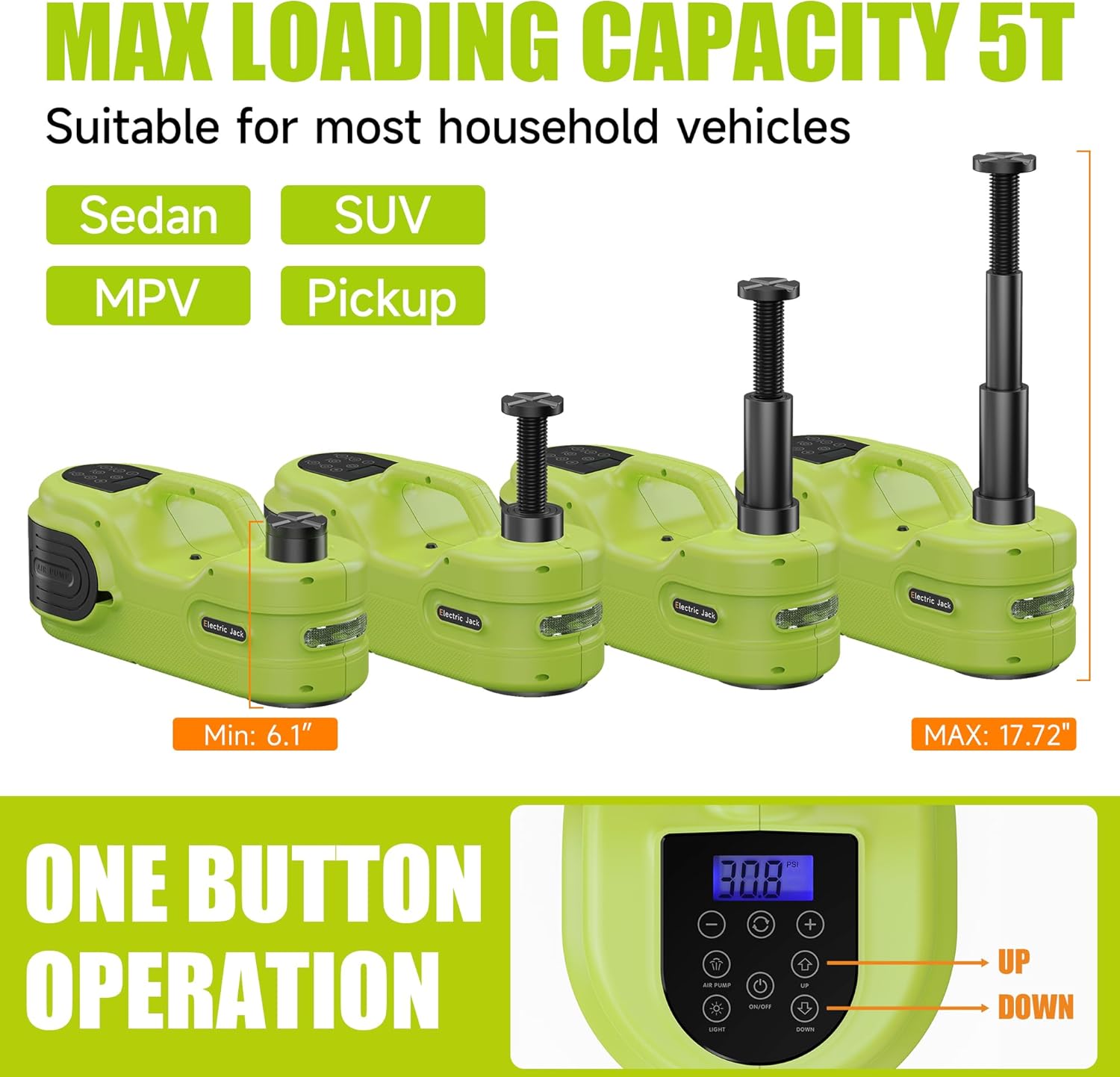- [Update Dual-Pump & LCD]The 3-in-1 Electric Car Jack 5T has a built-in dual cylinder air pump and LCD touch screen. Powered by cigarette lighter, car battery or other 12V DC power source, fully auto, save time and energy compare with manual jack.